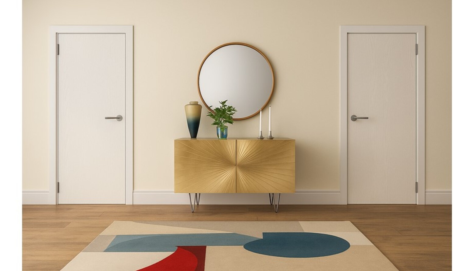 A beautifully designed sideboard in brass adds a sophisticated element, providing both storage and a surface for decorative items. The room features a striking round mirror in antique gold that reflects light and creates the illusion of more space. In one corner, a ceramic vase displays lush greenery, contributing to a refreshing and lively aesthetic.