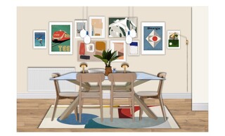 This dining room features a bright and inviting atmosphere accentuated by a warm color palette. The walls are painted in a soft neutral hue, creating a backdrop for the stunning collection of artwork that adorns them. Various framed pieces with vibrant colors and playful designs add a touch of personality to the space.