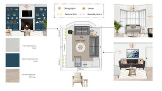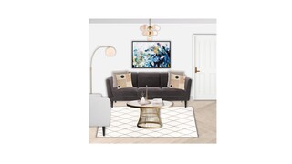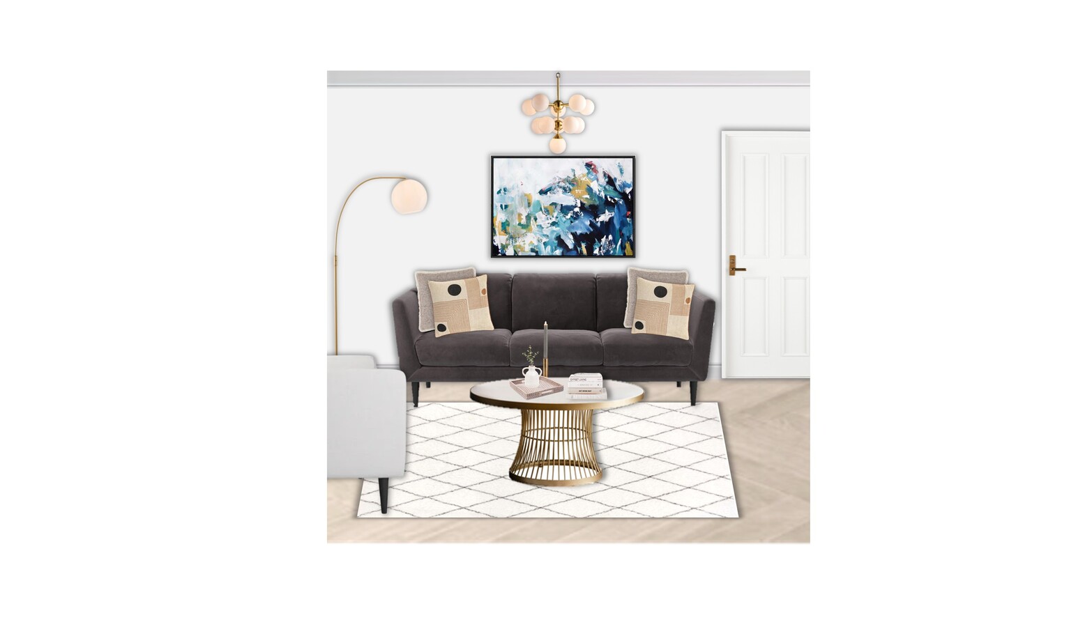 A Pembroke Armchair in Natural Linen offers a cozy reading nook, while a Clarke Coffee Table in Champagne adds a sophisticated focal point to the arrangement. Underfoot, a Moroccan Diamond Plush Rug in a generous size anchors the space, enhancing warmth and design cohesion.