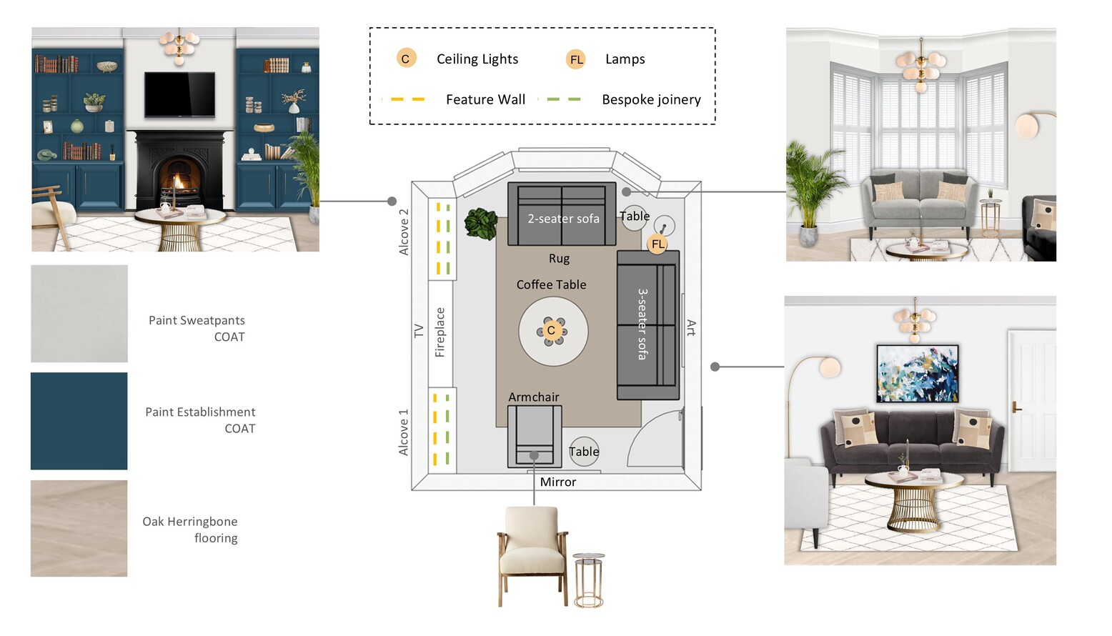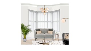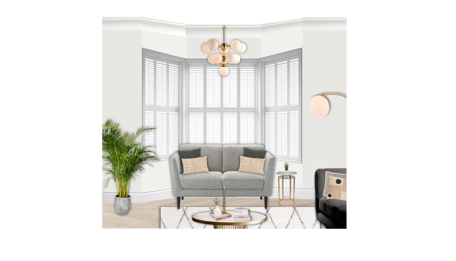 Lighting is elegantly addressed with an Oscar 11 Pendant Light in Brushed Gold, suspended above the coffee table, offering both style and illumination. The Otto Floor Lamp introduces further layers of light, ensuring the space is bright and welcoming.