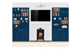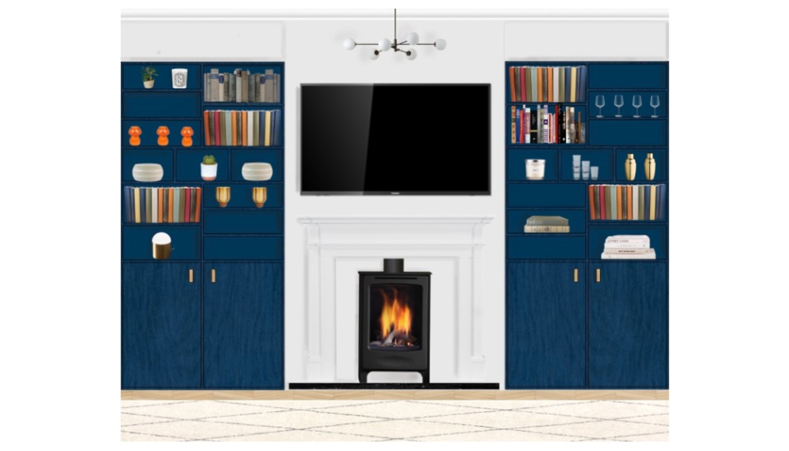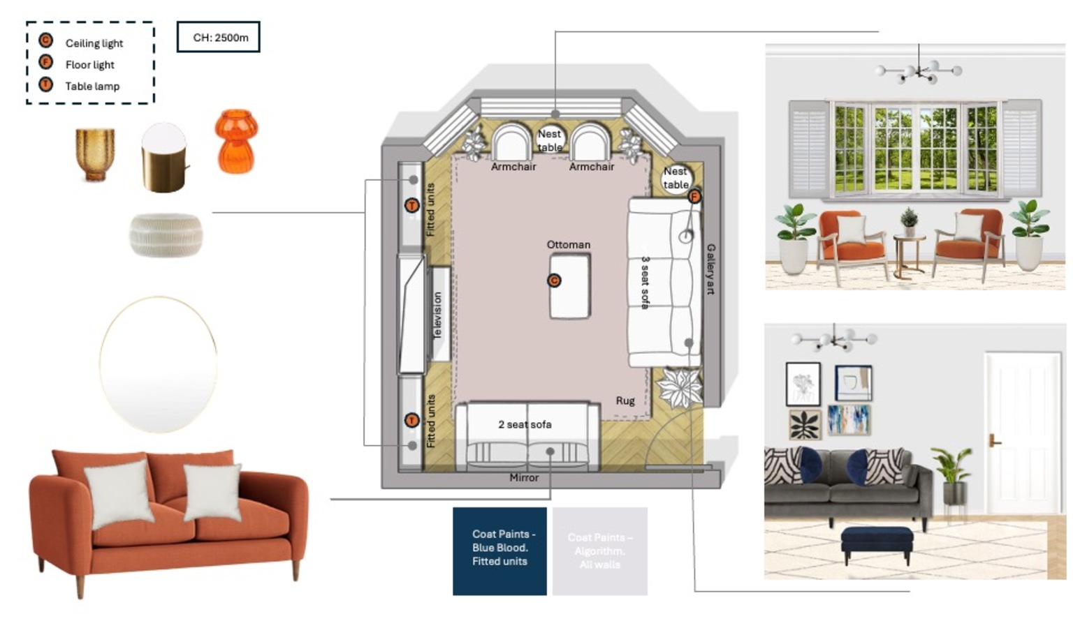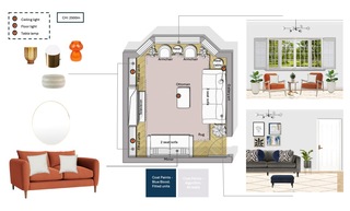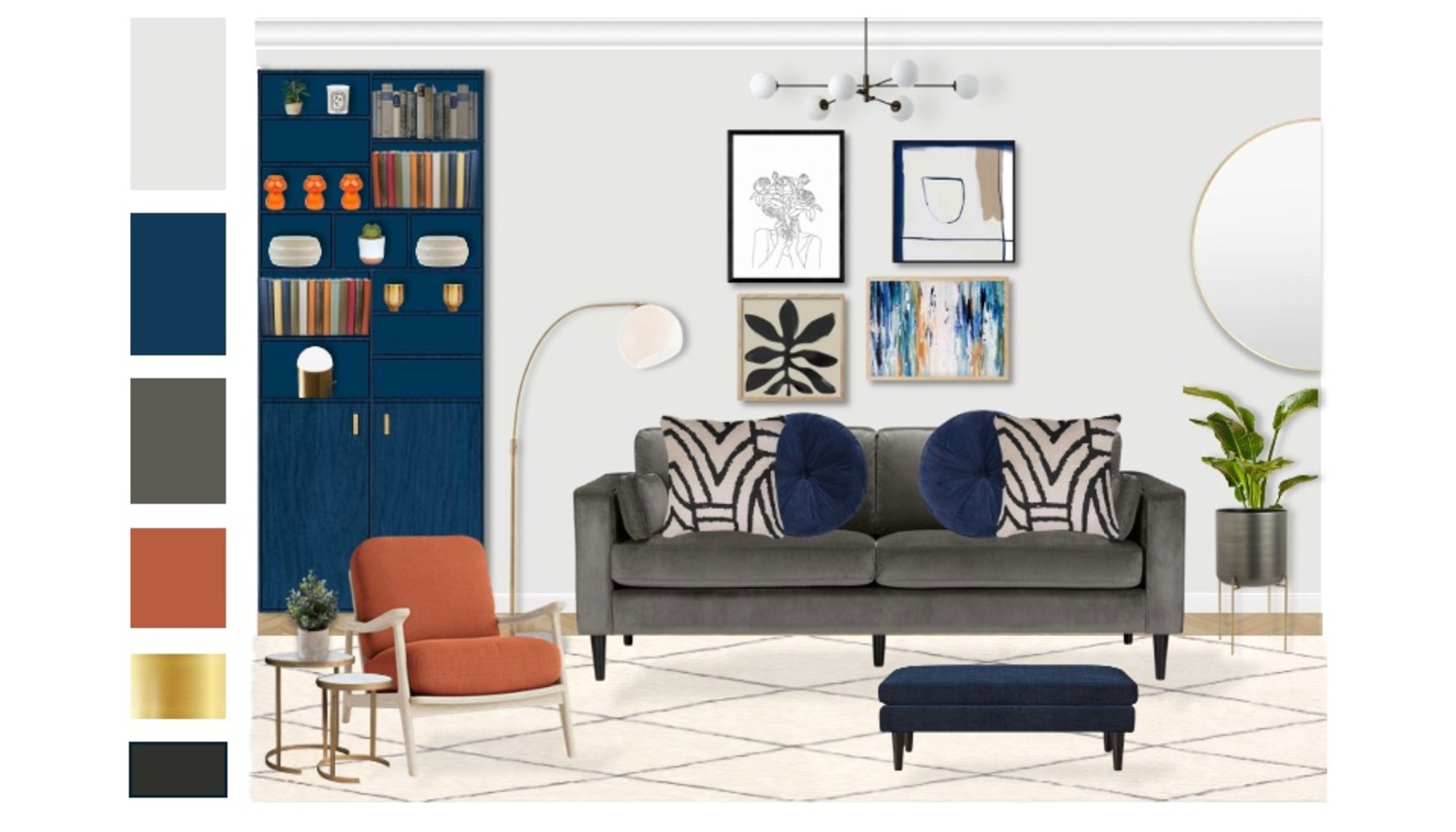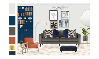This living room showcases a blend of modern comfort and playful accents. The centerpiece is a plush Hayward Velvet Grand 3-Seater Sofa, adorned with decorative cushions, including striking navy accent pillows. Adjacent sits a bright orange Loaf Small Squishmeister Sofa upholstered in linen, complemented by a matching accent chair wrapped in vibrant orange velvet. A sleek navy ottoman from Swyft adds functionality and style, inviting relaxation. Underfoot lies a soft Benno Cream shaggy rug, providing warmth and texture against the stylish tiled flooring. The lighting is both practical and artistic, featuring the Chelso six-light bronze and opal pendant above, alongside a Bay Lighting Hettie Marble Floor Lamp that casts a warm glow. Decorative elements adorn the space, including a John Lewis Plaza Marble Topped Nest of Tables in white marble that adds elegance. A Holworth Round Gold Mirror reflects the room's light while creating a sense of depth. Plants are situated thoughtfully, like the John Lewis Large Indoor Iron Planter with its brass stand and the stylish Aiguablava plant pot in white cement, bringing a touch of nature indoors. The walls are adorned with framed art pieces, including a line art flower head, which complements the overall theme. Shelves on a vibrant blue cabinet display books and whimsical decor items, while the Bandhini Homewear Design Earth File Print Lounge Cushion introduces additional comfort to the seating area. This living room elegantly balances sophistication and playfulness through its choice of colors, textures, and furnishings.