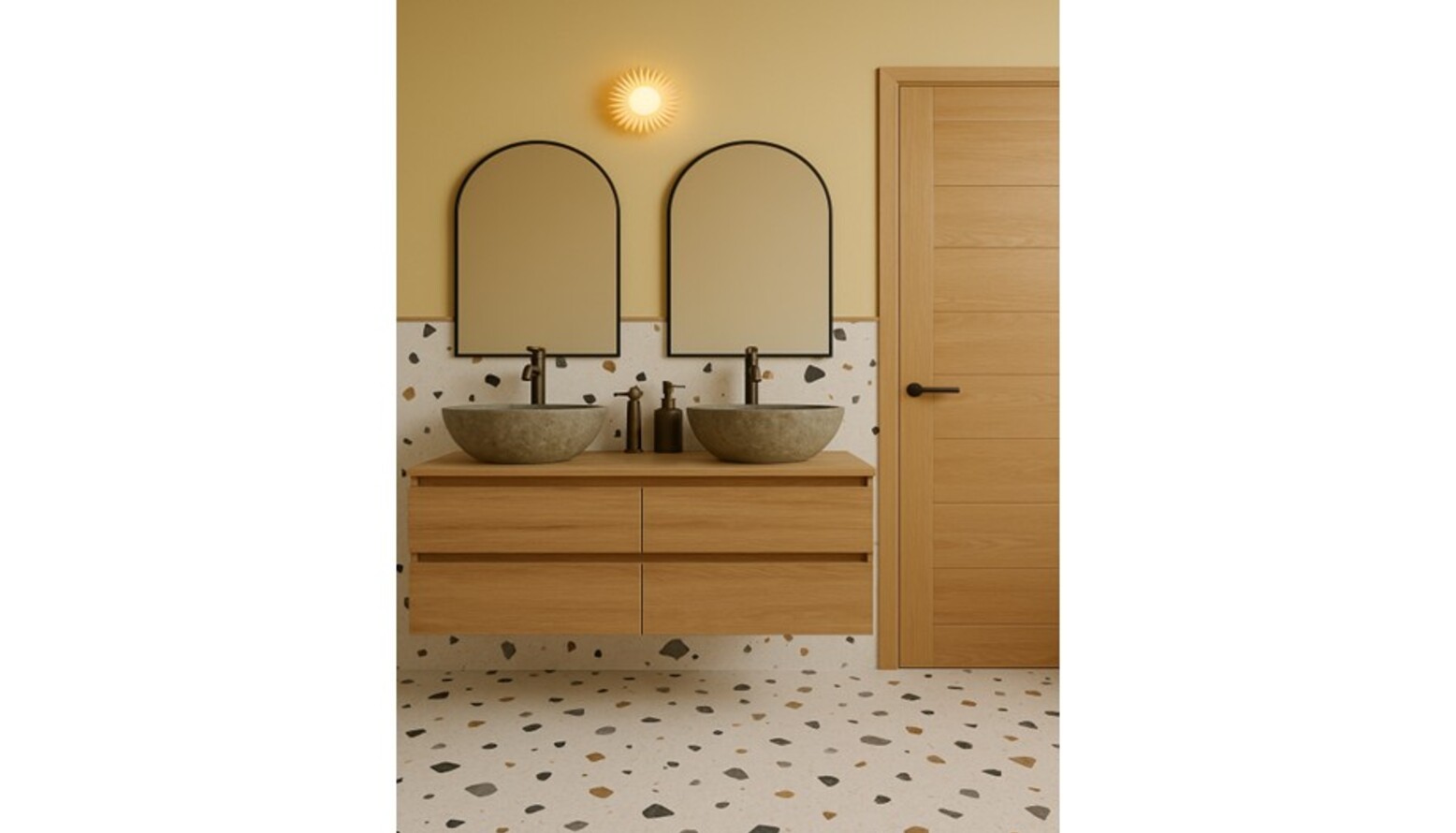A stylish vanity unit made of light wood provides ample storage, complemented by two round, concrete basins that add a natural touch. Above each basin, sleek, arched mirrors reflect the space beautifully, framed in black for a striking contrast. The fixtures, including a tall basin tap and a mini basin mixer tap, are elegantly finished in a matte black, harmonizing with the overall color scheme.