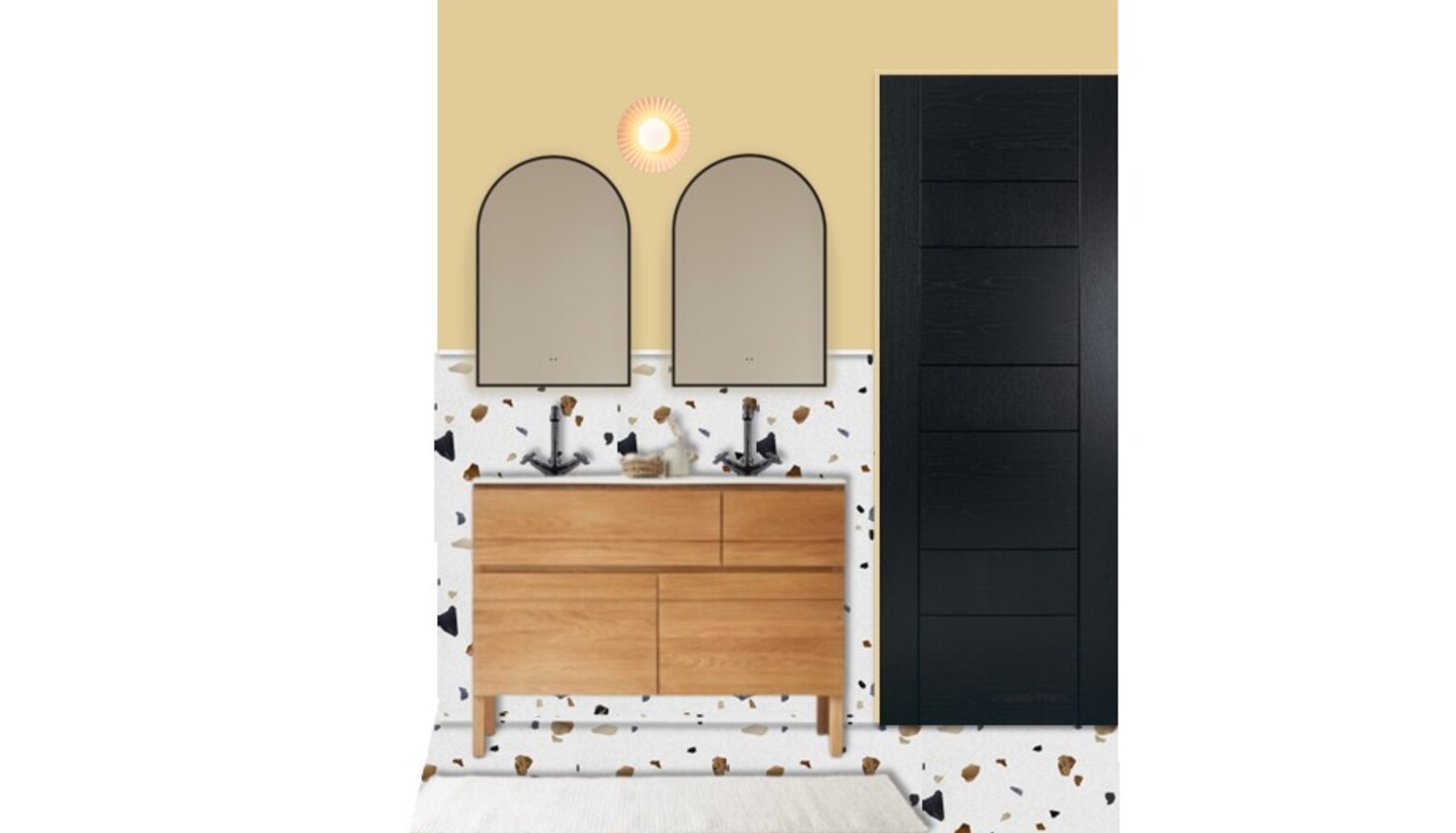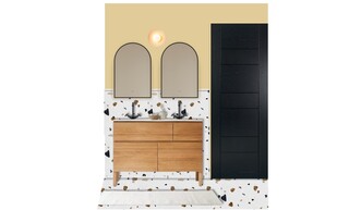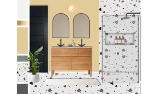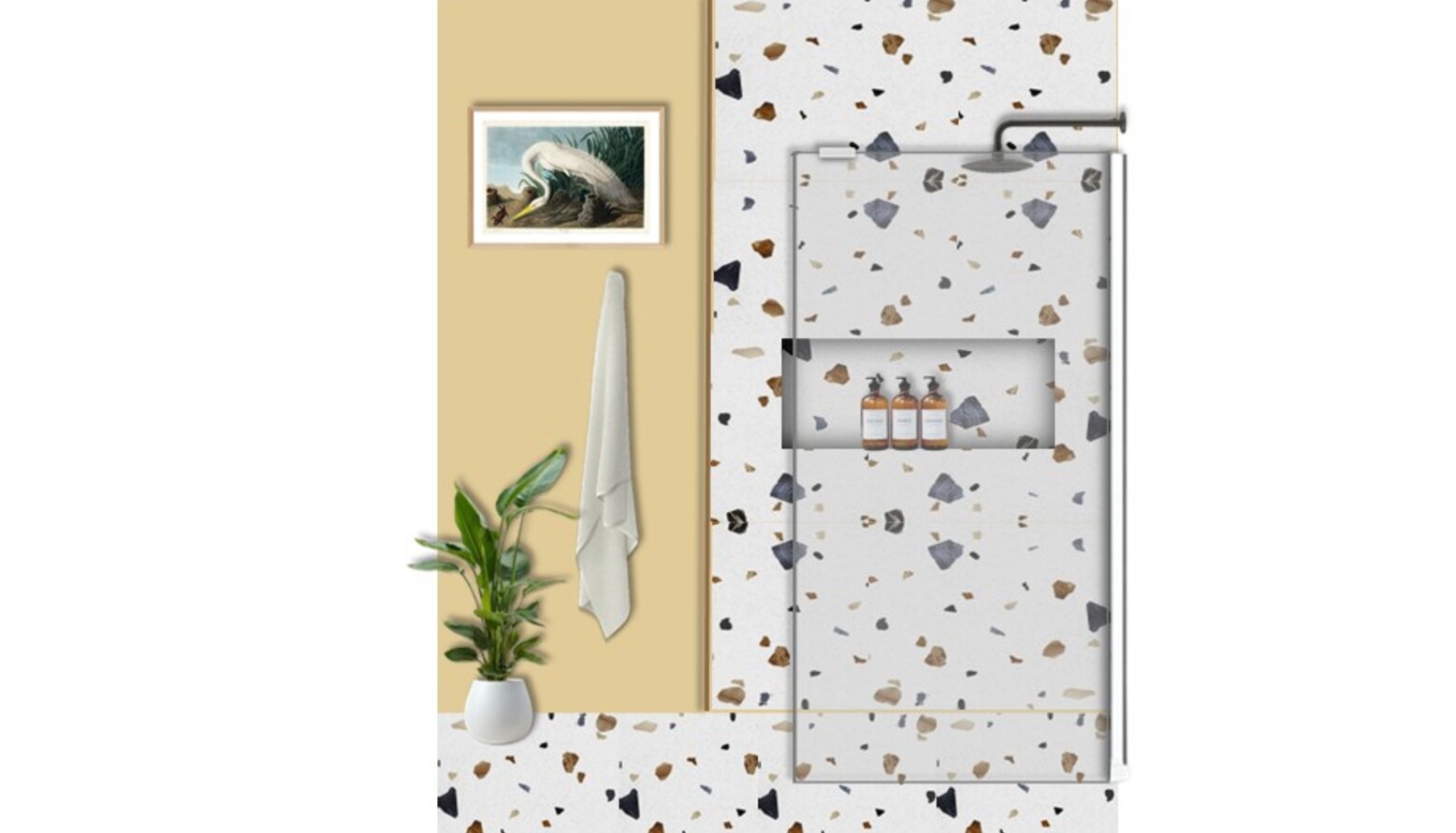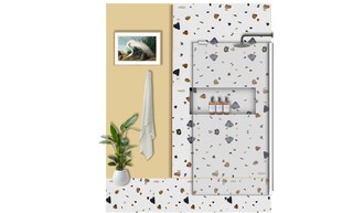 This bathroom features a contemporary and clean design with a focus on functionality and modern aesthetics. The walls are adorned with a warm yellow hue, creating a welcoming atmosphere. A feature wall showcases textured tiles in a terrazzo pattern, incorporating shades of black, grey, and warm neutrals.