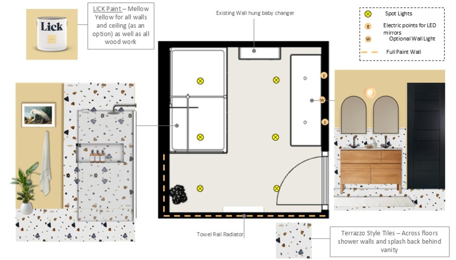 I have included some great paint colour suggestions for your room design with handy links so you can order any samples you want and then your chosen paint directly from the retailer when you are ready. It’s always best to use the retailer's paint calculator, or your decorator's estimate for paint quantity and ensure you order the appropriate finish suitable for bathrooms.