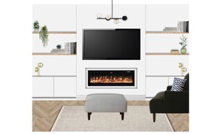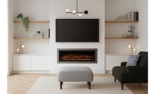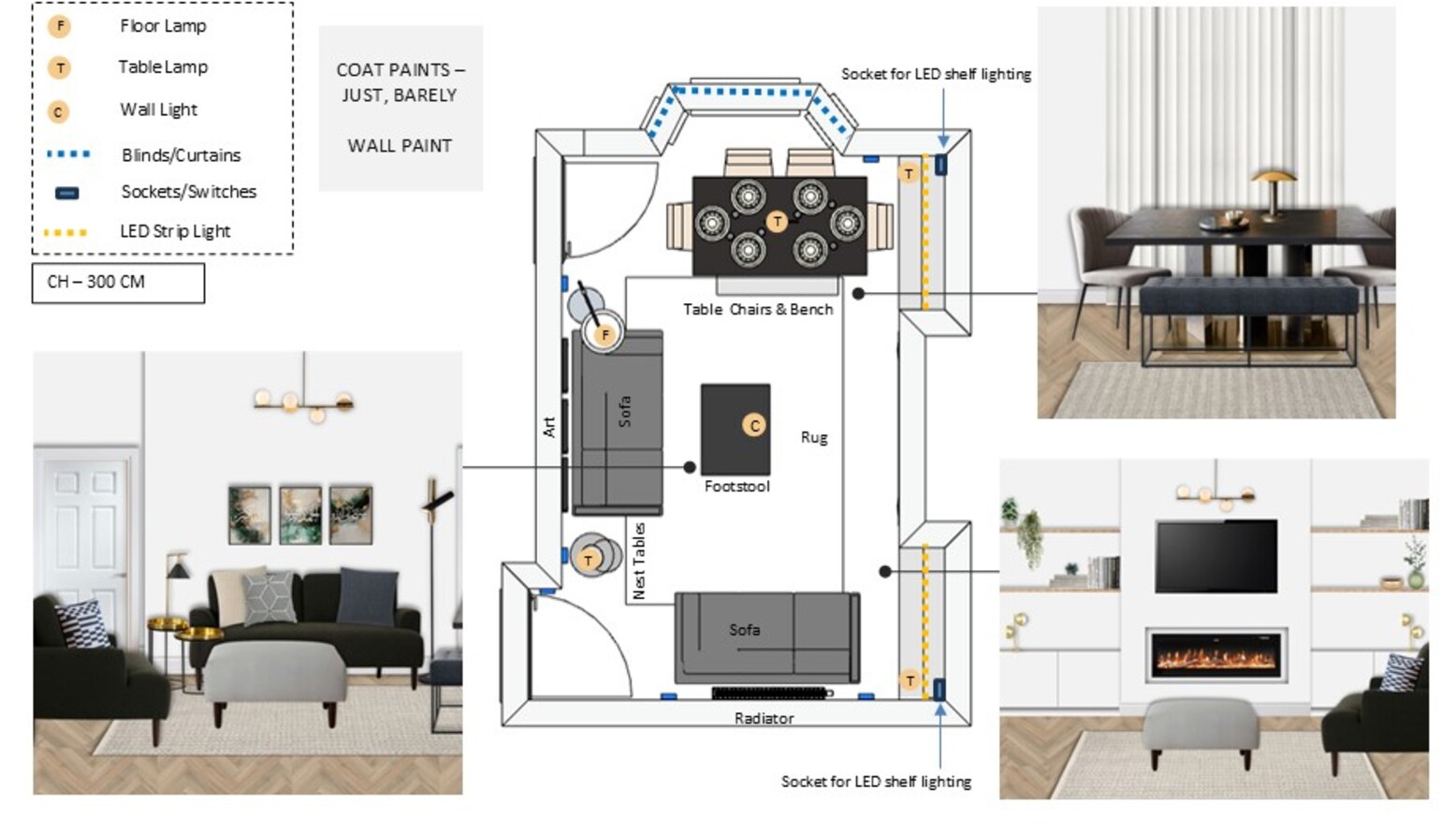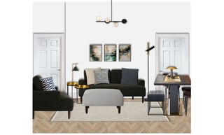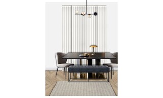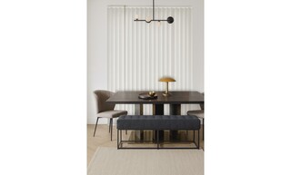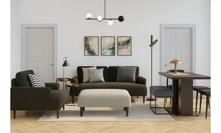 A stylish dual-function living and dining area with a soothing color palette and modern design. The room features a chic two-seater sofa in a rich fern hue, complemented by a variety of cushions, including the rib weave cushion in natural. A cozy coffee table in a soft beige fabric sits centrally on a textured light-colored rug, inviting relaxation. Adjacent to the sofa, a sleek black ash dining table accommodates six, surrounded by dark grey soft touch boucle dining chairs, emphasizing comfort and elegance. In terms of lighting, a distinctive black and brass swivel floor lamp stands next to the sofa, offering a blend of practicality and style, while an artistic chandelier with lights in varying sizes hangs overhead, adding a touch of sophistication. The space features striking artwork framed in black showcasing abstract designs in greens and golds, mounted on the wall, enhancing the modern aesthetic. Additional light sources include a chic table lamp on a side table and a decorative ceiling light. Thoughtfully placed accessories, such as a gold lacquer tray and intricately designed nesting side tables, provide functional style to the layout. The overall design combines elements of comfort with a curated selection of modern decor, creating an inviting atmosphere for both relaxation and dining.
