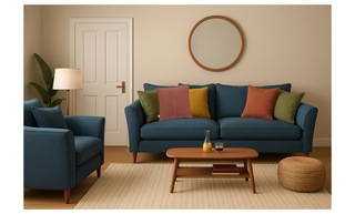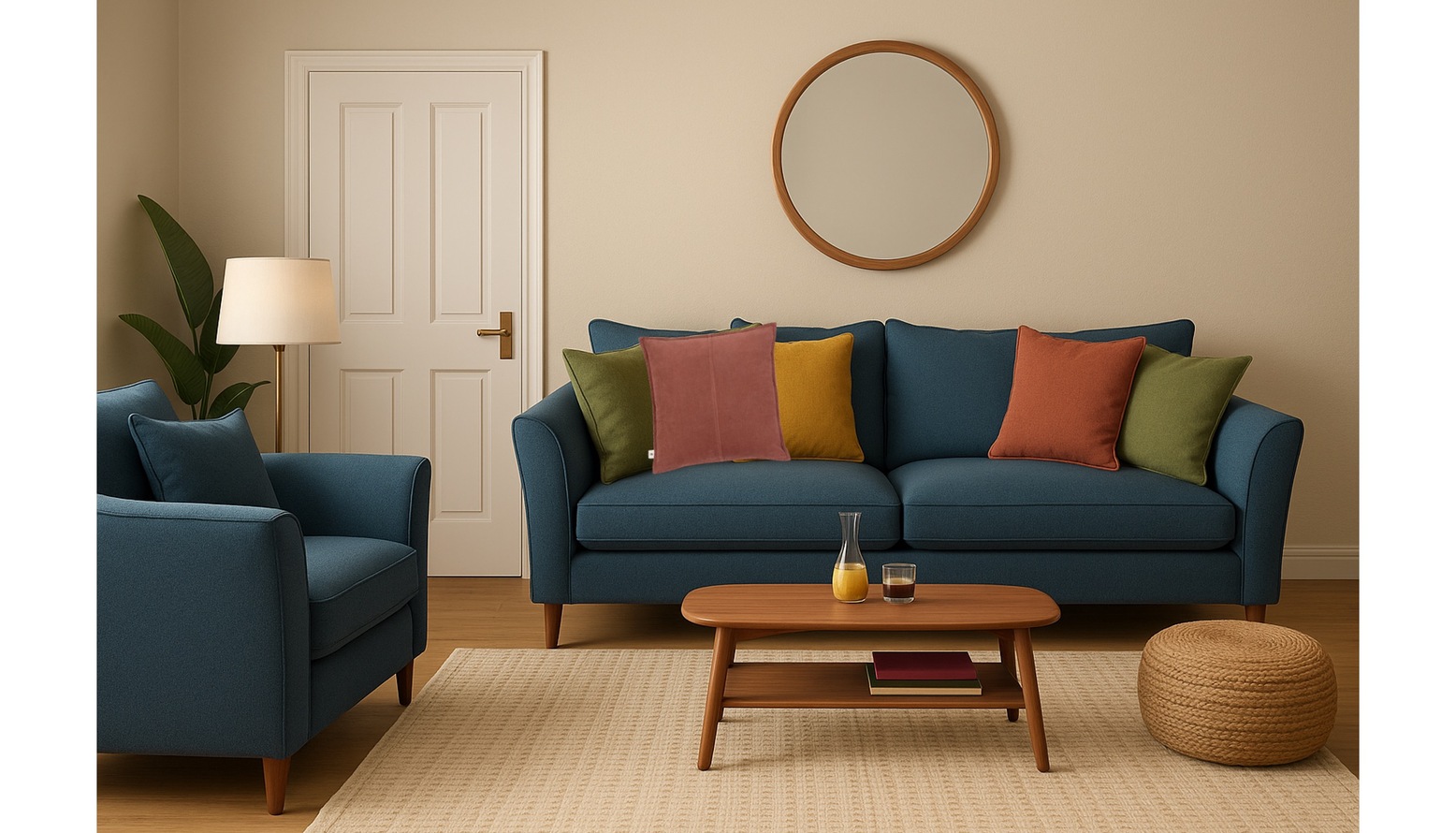 Central to the space is a medium brioche sofa upholstered in a vibrant blue cotton, adorned with a variety of textured cushions in earthy tones of olive, rust, and sunflower yellow. Next to the sofa, a cozy accent chair in whitewashed oak features a bold orange twill fabric, inviting leisurely seating.