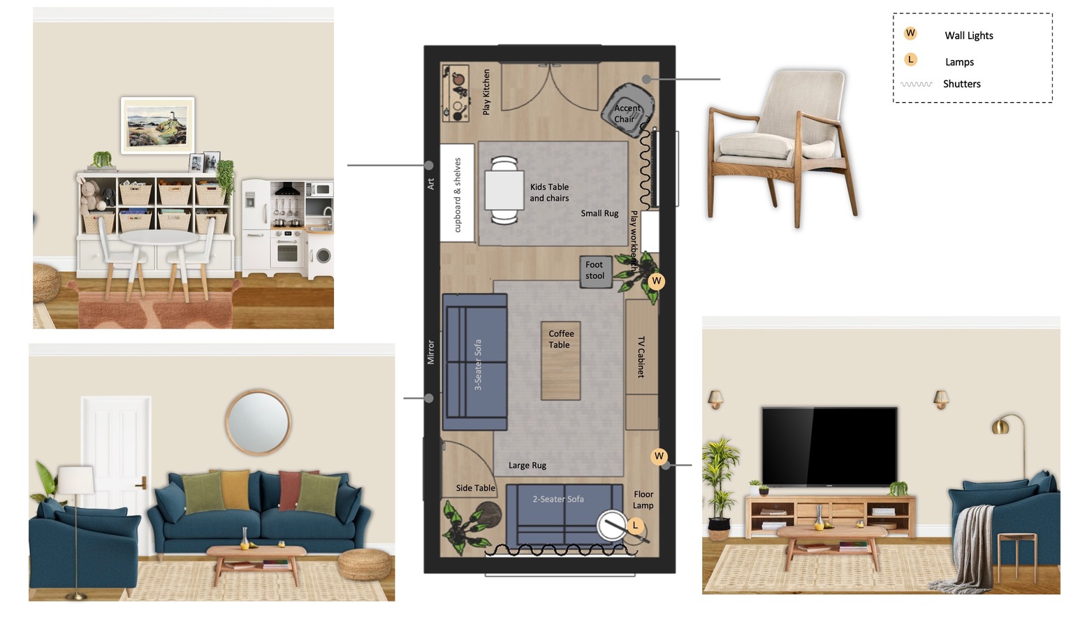I’m delighted to share your final room design and product suggestions. Don’t forget to click on the video under your moodboard to watch your virtual design presentation!