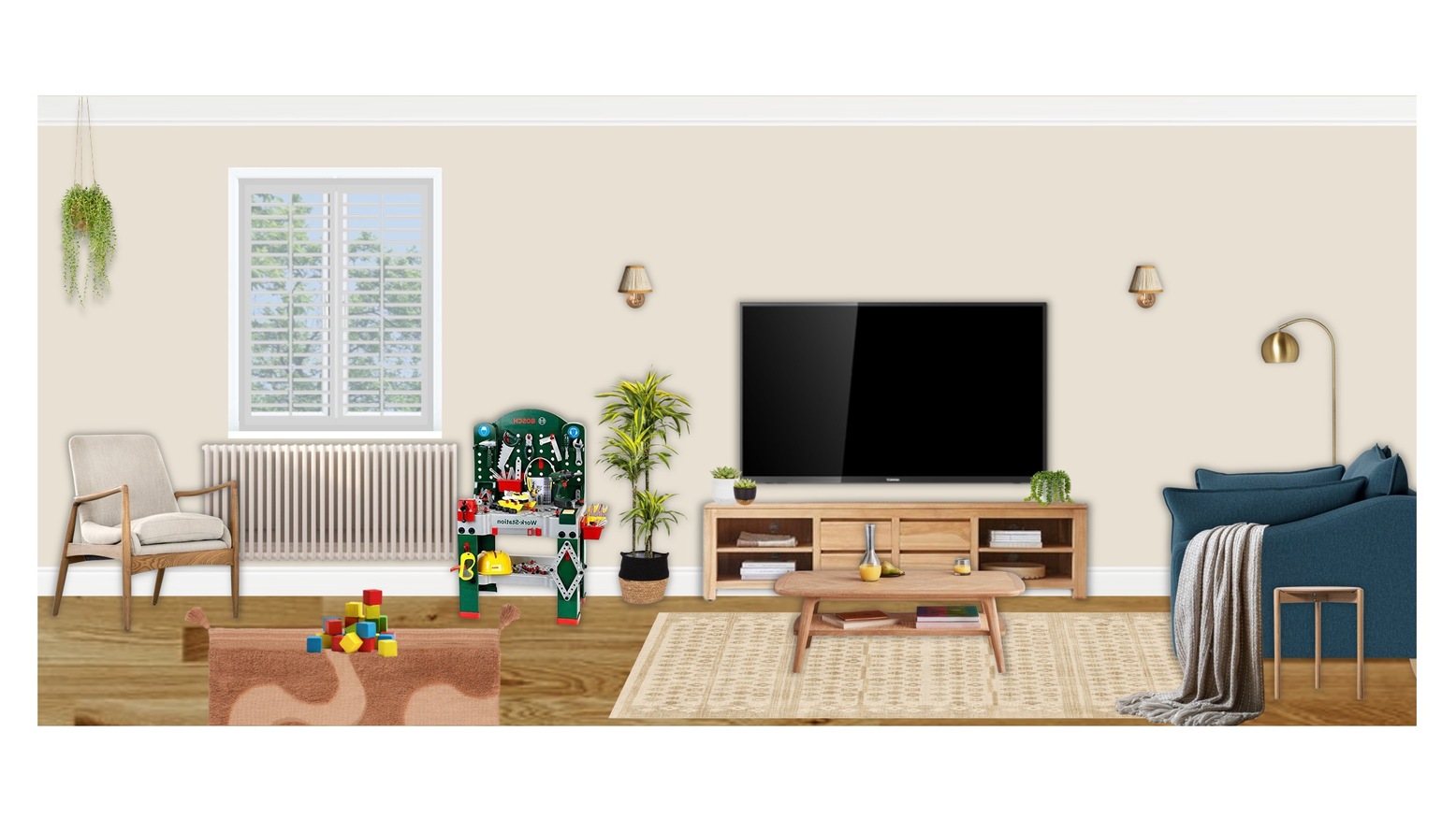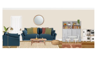 This living/playroom showcases a harmonious blend of comfort and style, ideal for both relaxation and play. The walls are painted in a warm, neutral tone, complementing the natural light that fills the room.