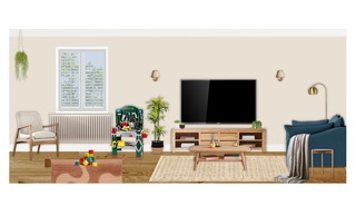 Lighting is provided by a stylish floor lamp in brass, alongside a versatile wall-mounted fitting, casting a warm glow across the room. Real and faux greenery enhance the vibrant atmosphere, with carefully selected pots that coordinate beautifully with the decor.