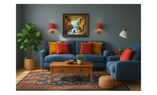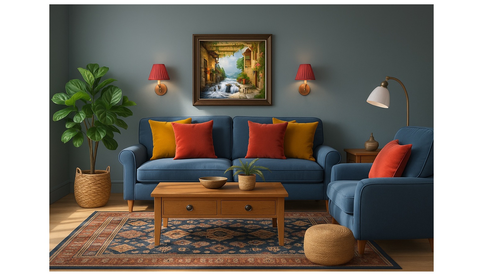 The living room features a cohesive blend of colors and textures, creating a warm and inviting atmosphere. A striking blue velvet large sofa, adorned with vibrant cushions in hues of orange and yellow, acts as the focal point against the softly painted walls in Inchyra Blue. Lush greenery from a medium faux fiddle plant enhances the space, providing an organic touch.
