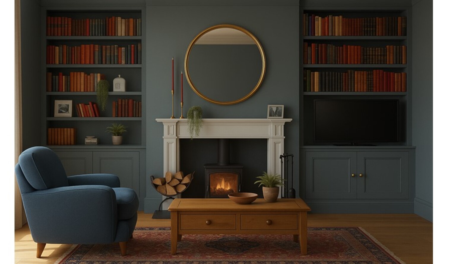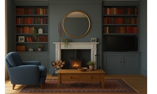 Underfoot, a rich patterned rug anchors the seating area, while a charming side table in weathered oak holds personal items and enhances the room's style. Artwork, framed beautifully, adds a personal touch and visual interest to the walls, harmonizing with the overall decor. The choice of decorative elements and finishes, including brass details and textured fabrics, creates a sophisticated yet cozy space perfect for relaxation or entertaining.
