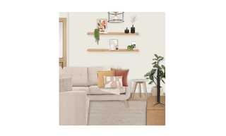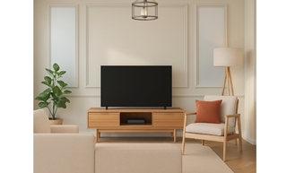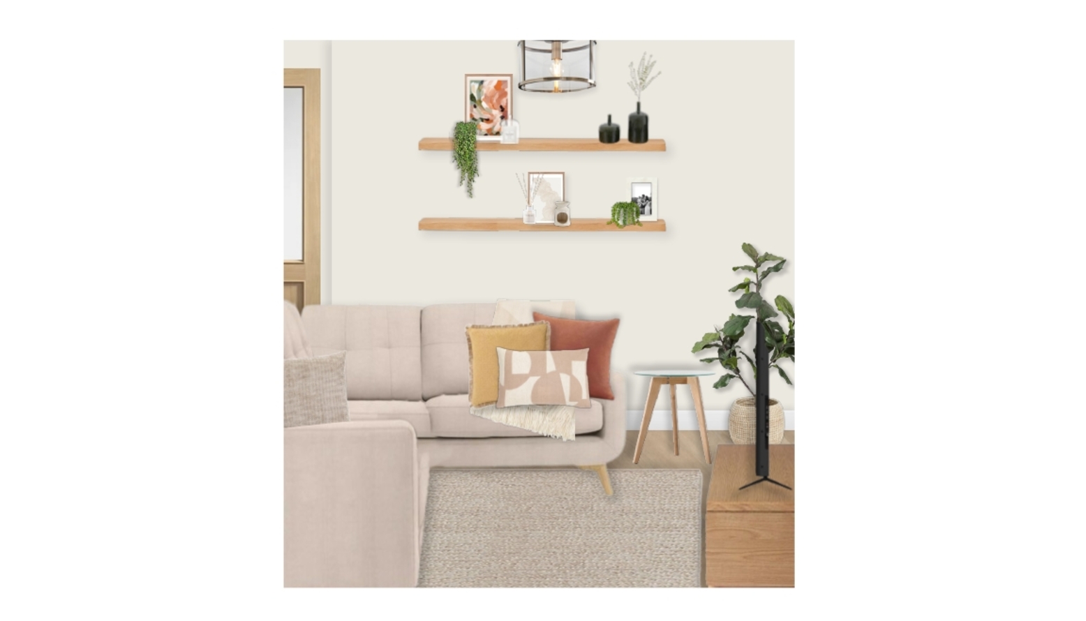A spacious wool rug in a subtle beige tone anchors the seating area, providing both comfort and style. The focal point is a modern oak TV unit, designed to accommodate televisions up to 60 inches. Above this, a stylish wall-mounted full-length mirror reflects light and adds depth to the space.
