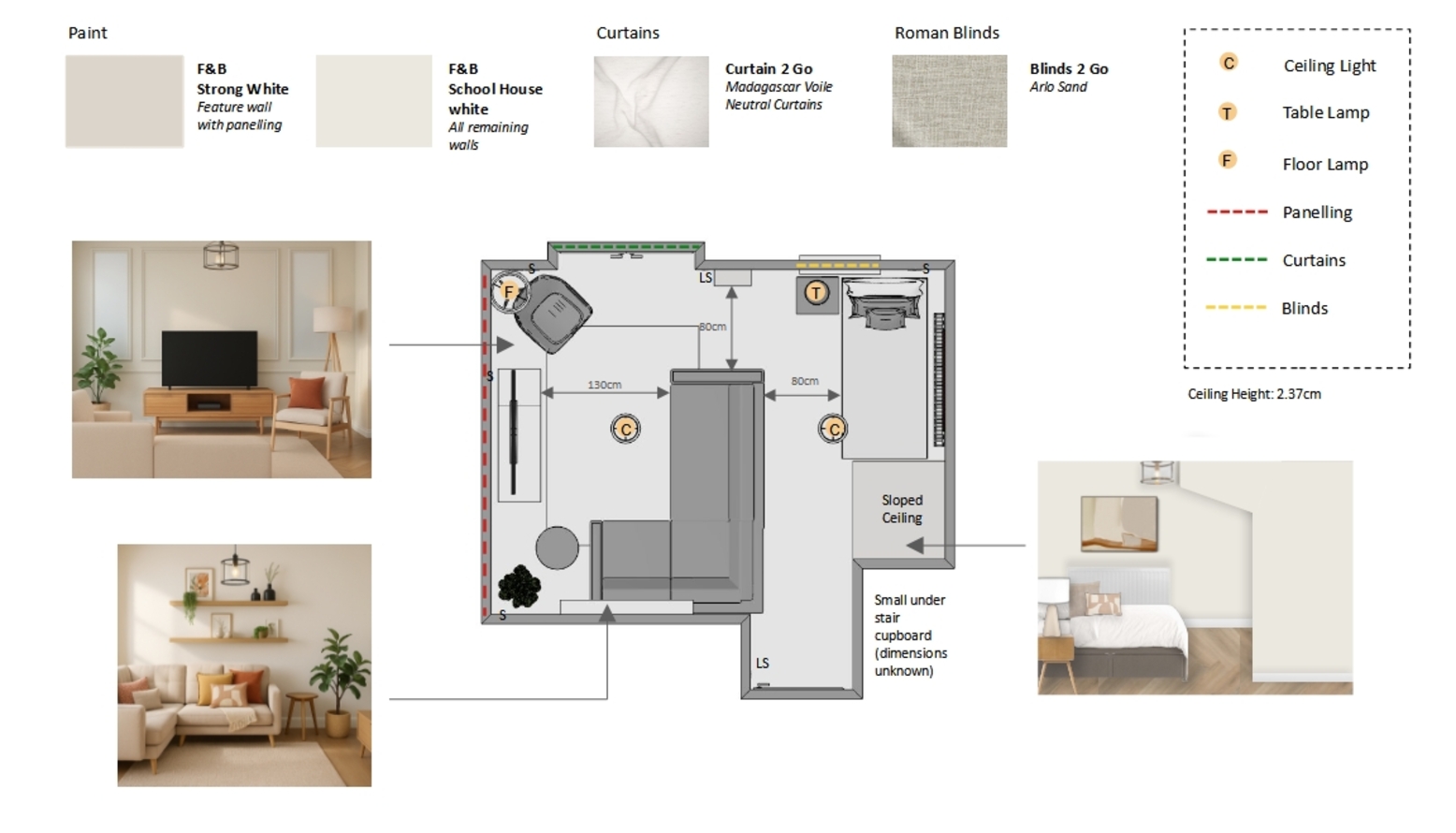 Lighting is well-considered, featuring an elegant tripod floor lamp with a natural shade, paired with a flush ceiling light that adds an inviting glow.