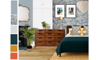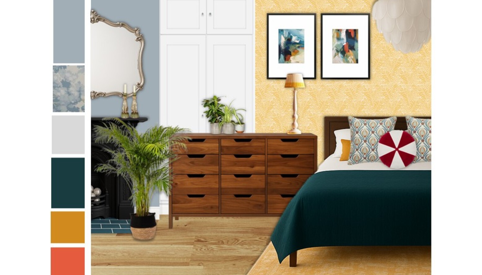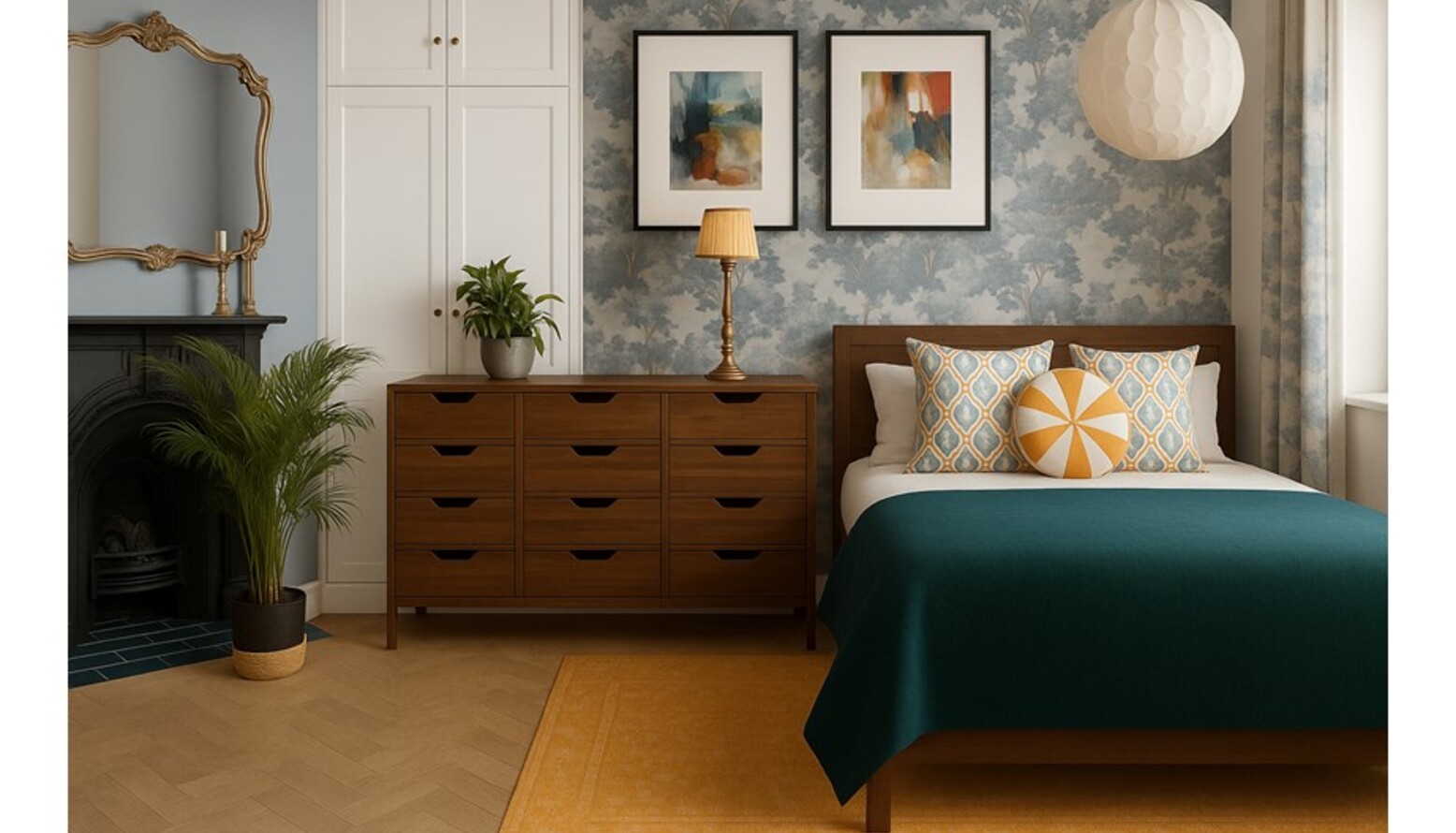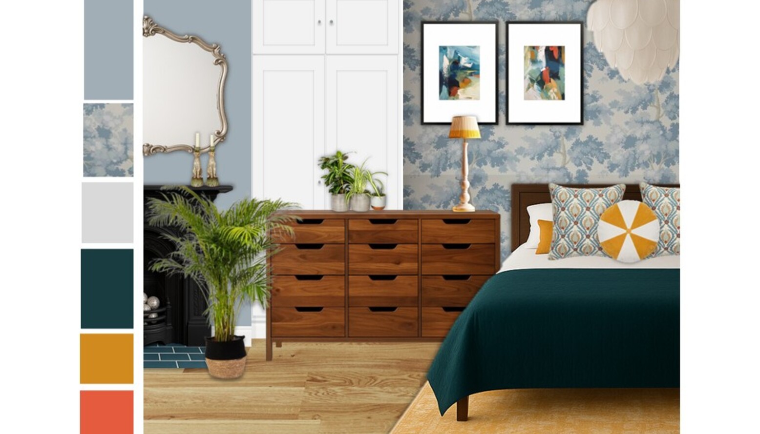 The room features a beautifully styled bedroom with a warm and inviting color palette. The walls are adorned with eco-friendly blue wallpaper showcasing delicate tree motifs, creating a serene backdrop. A cozy bed takes center stage, dressed with a rich teal bedspread that contrasts nicely with crisp white bedding.