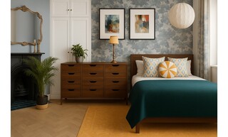 Opposite the bed, a wooden dresser with multiple drawers offers practical storage while complementing the overall aesthetic. Above the dresser, two framed artworks introduce subtle pops of color, harmonizing with the room's theme. A classic table lamp with a bronze base and warm glow sits on the dresser, enhancing the ambiance.