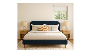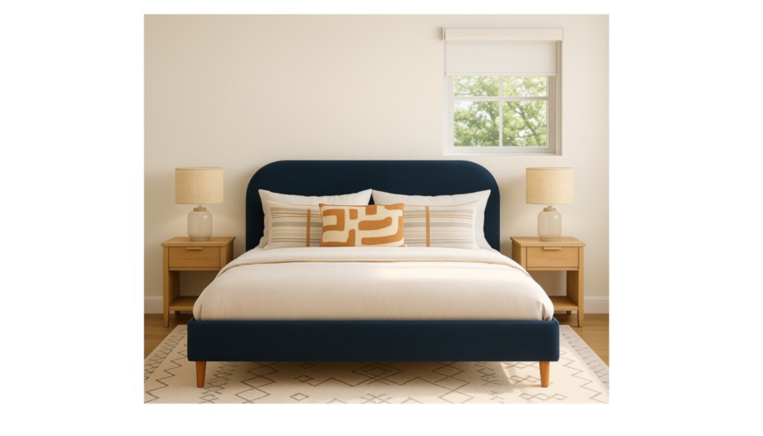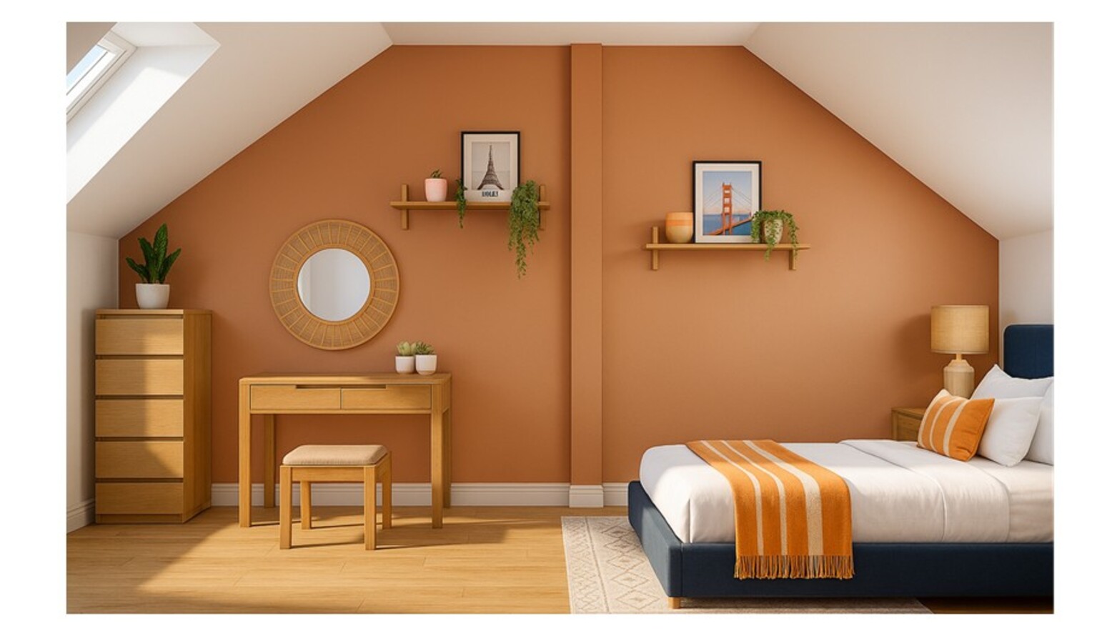 The bedroom features a harmonious blend of warm hues and natural elements, with a cozy atmosphere enhanced by a well-thought-out design. The walls are painted in a rich, earthy tone that creates a welcoming atmosphere. A sleek navy sofa bed adds functionality while maintaining a sophisticated look.