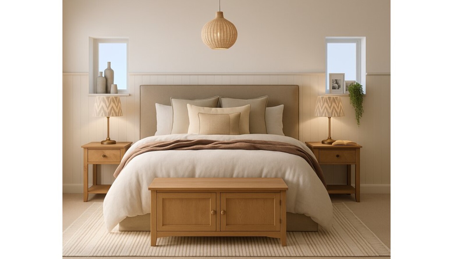 Flanking the bed are two stylish side tables, crafted from whitewashed oak, exuding a warm and rustic charm. Each side table is topped with a muted patterned lamp that softly illuminates the space, enhancing the cozy atmosphere.