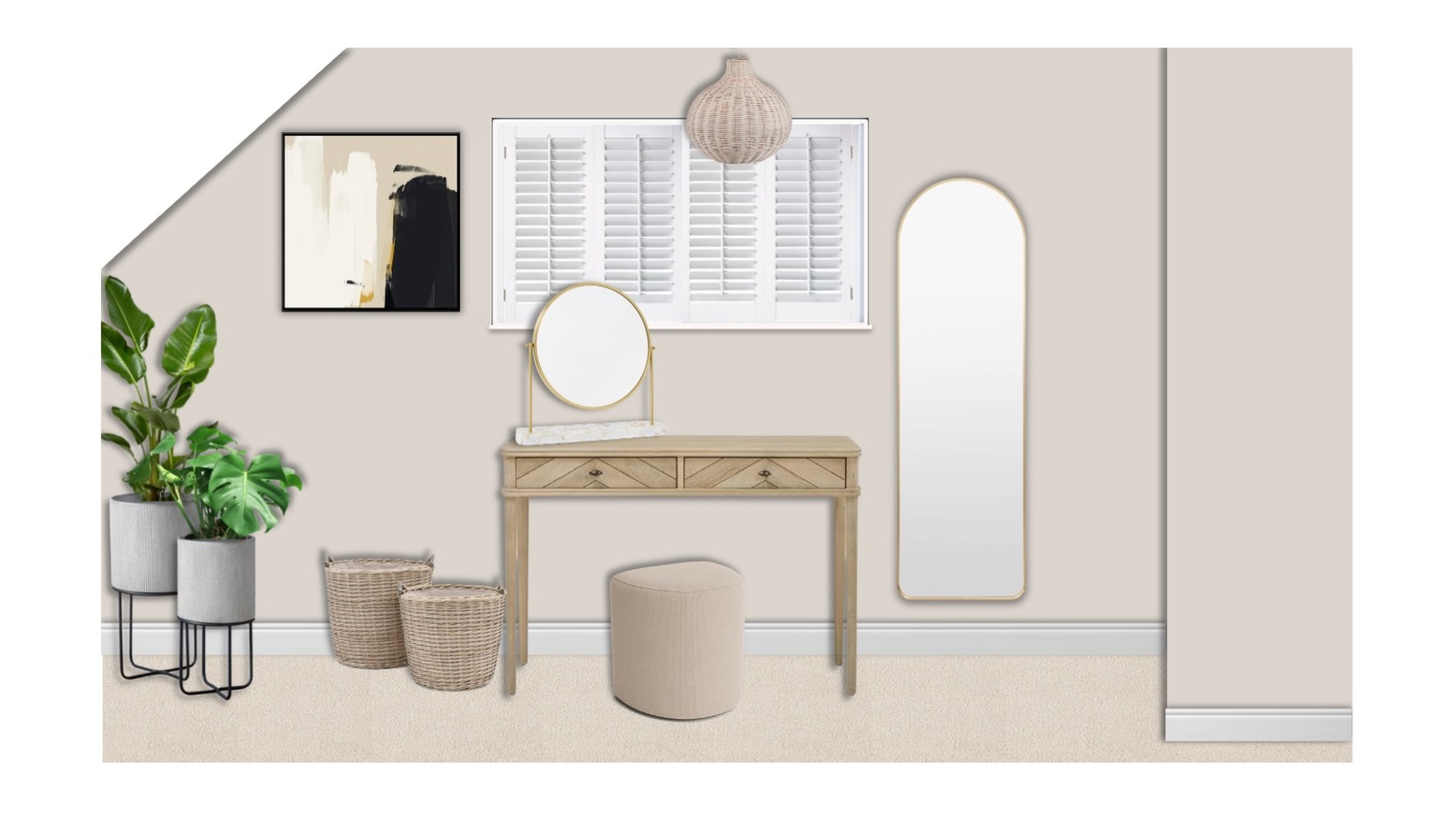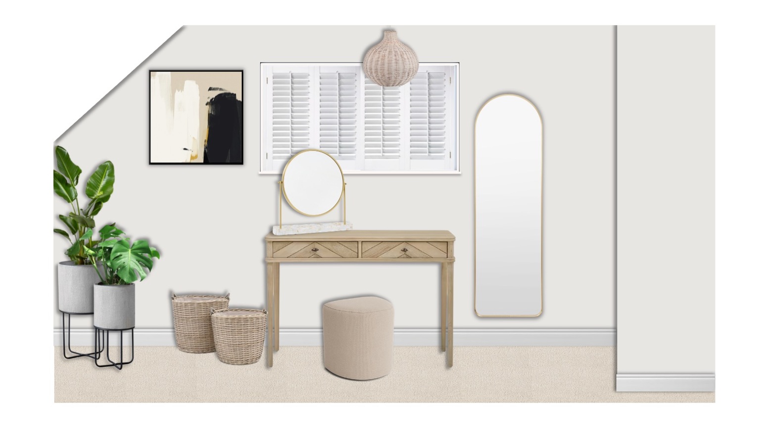 I have included a great selection of real and/or faux plants for your room with some lovely planter options also. Please be sure to check the size of the planter or basket fits the plant pot of the plant you have chosen if you select an option from the alternatives! You can purchase the real plants through our shopping service if you wish or you can use this as a style guide and source them from a local garden centre.