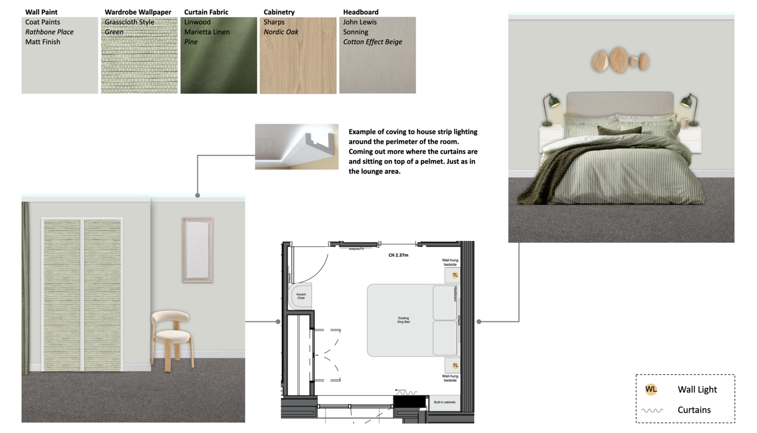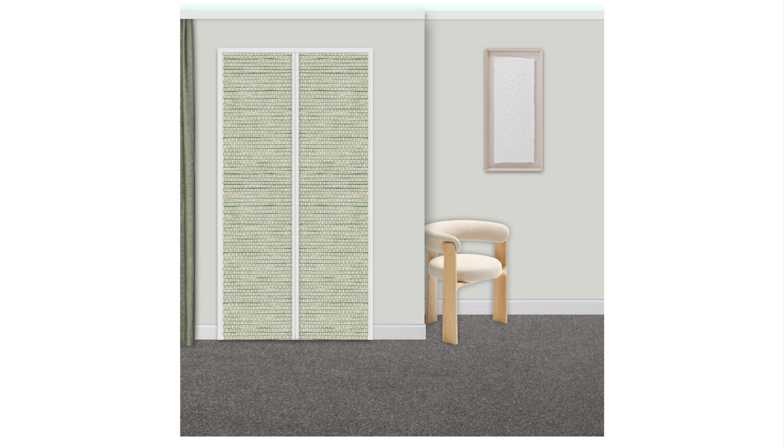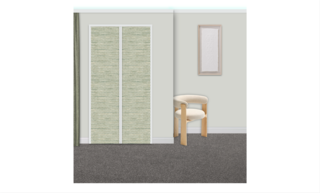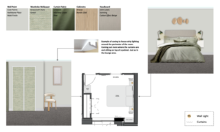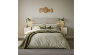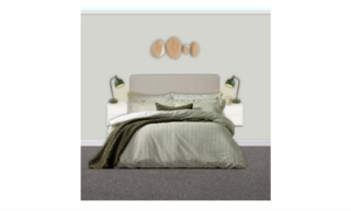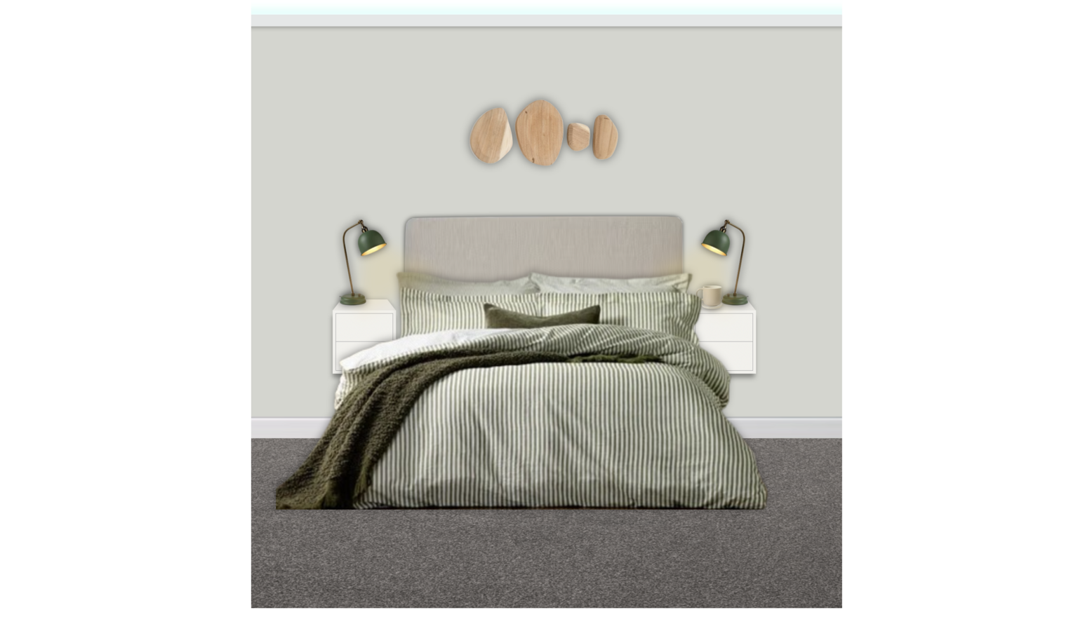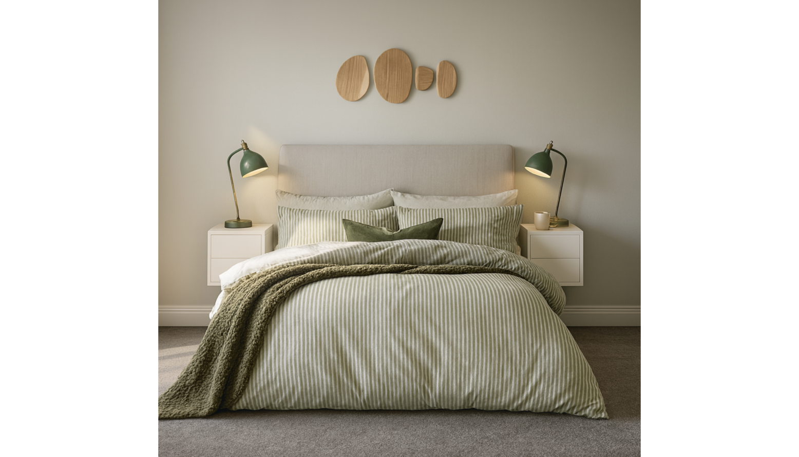 This guest bedroom showcases a serene and inviting atmosphere with a carefully curated color palette. The walls are painted in a soft, neutral hue, providing a calming backdrop. The focal point is a king-sized upholstered headboard in a light beige fabric, framed by two white nightstands that offer a minimalist aesthetic. Each nightstand is adorned with striking dusty green table lamps that add a touch of color and functionality. The bed is layered with a textured duvet cover featuring delicate stripes in shades of green, paired with patterned pillows, including a standout dark green cushion for contrast. A cozy green blanket is casually draped over the bedding, enhancing the warmth of the space. Above the headboard, a unique arrangement of wooden wall panels adds an artistic element, bringing in natural materials. Plush carpeting underfoot adds comfort, creating an overall sense of tranquility and relaxation in this thoughtfully designed guest bedroom.