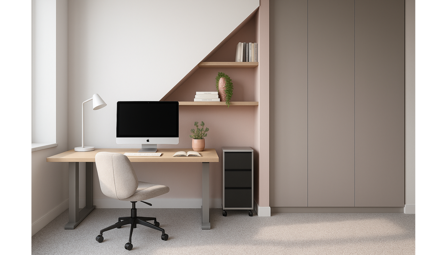Above the desk, wooden shelving in a matching finish adds both practicality and visual interest. The shelves are adorned with a few carefully selected books and a decorative plant, contributing to the serene ambiance of the room.