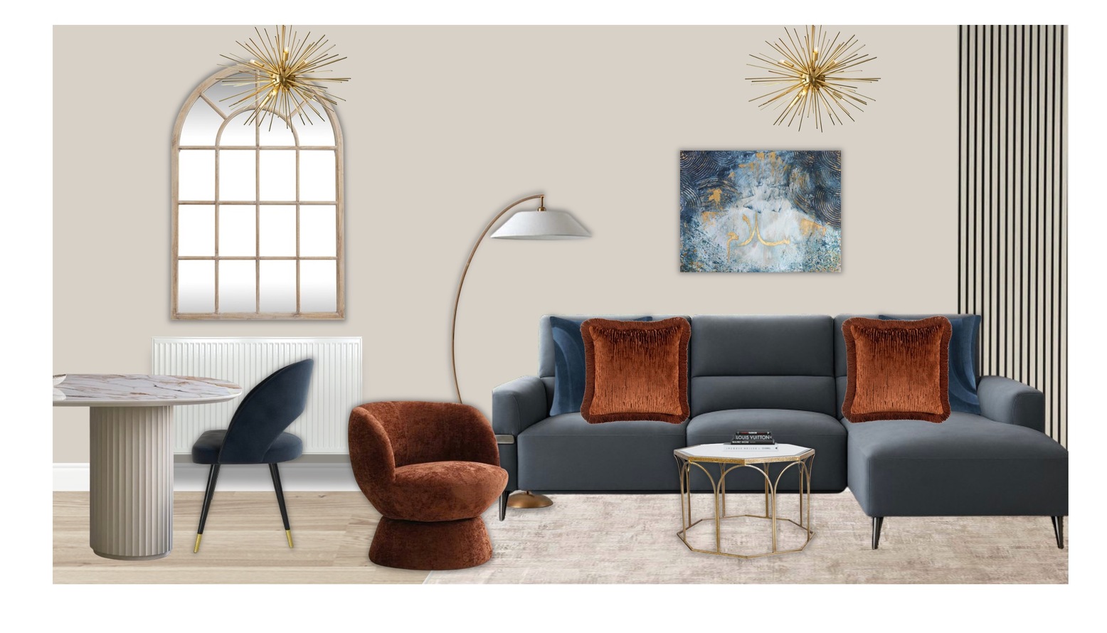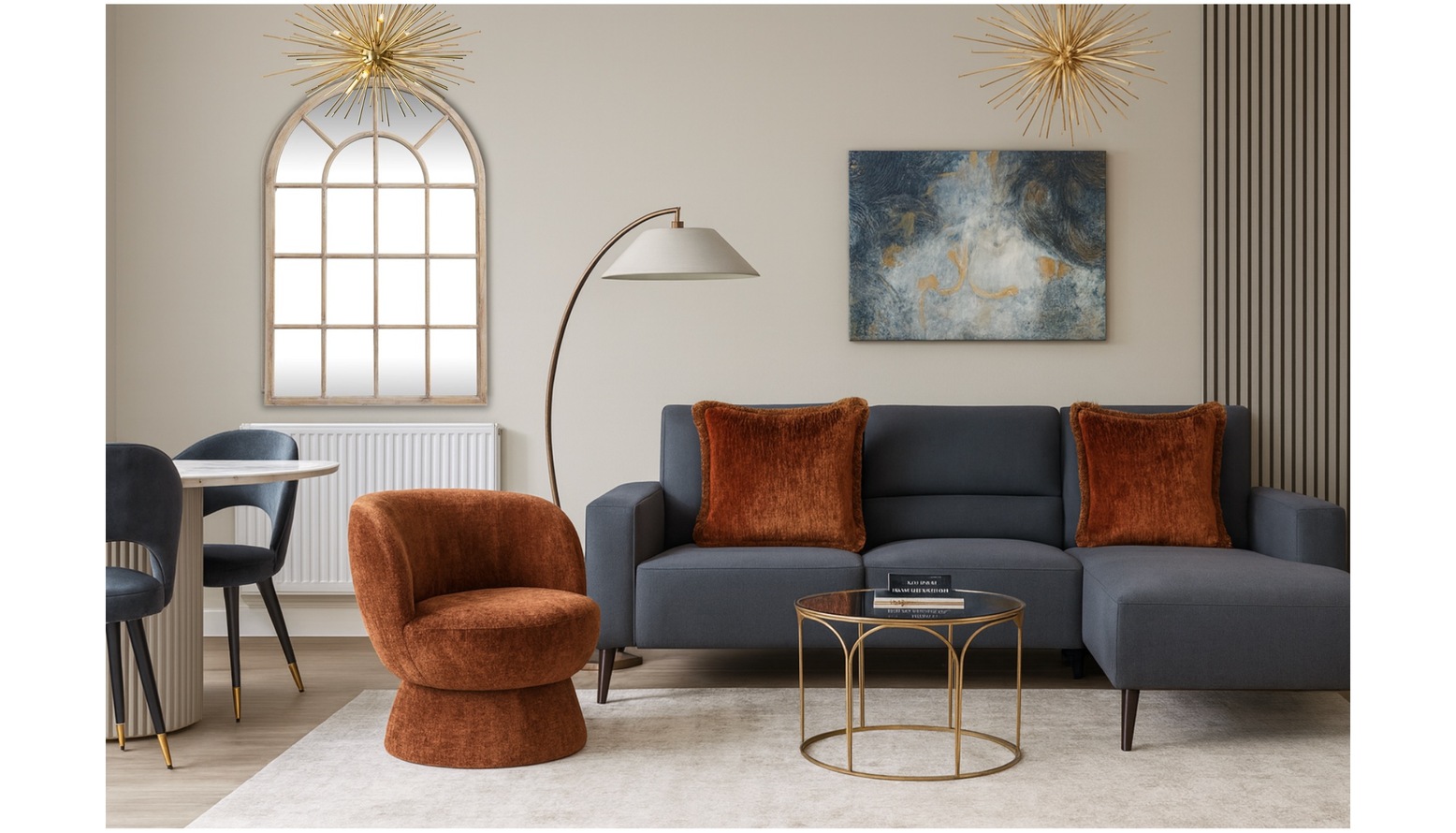 A striking rust-colored curved accent chair complements the sofa while adding a pop of color.