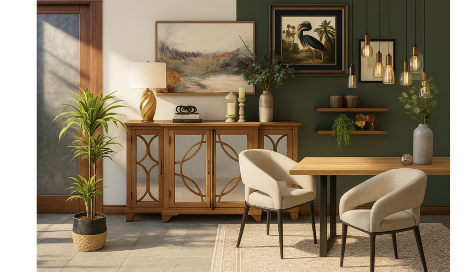 The kitchen dining area features a harmonious blend of modern and natural elements. A stylish Inigo Sideboard crafted from recycled elm serves as a functional storage piece, complemented by the elegant Divine 8 Light Black Metal & Glass Cluster Ceiling Pendant Bar, providing both illumination and artistic flair. Two plush ivory dual-tone fabric dining chairs from Danetti surround a sleek wooden dining table, perfect for sharing meals and conversations. On the wall, thoughtful decor includes framed artwork, such as a 'View To Sea' canvas and a classic piece showcasing avian beauty, enhancing the visual interest of the space. A Loaf Medium Swirl Table Lamp in a smoke finish sits gracefully on the sideboard, adding warmth and sophistication. The room is grounded with an Elias Beige rug, creating an inviting atmosphere. Floating shelves made of oak, namely the Millie Floating Shelf, provide additional decor space while holding carefully selected items like a seeded eucalyptus stem, which brings a touch of greenery indoors. Finally, the Garden Trading Fulbrook Mirror adds depth, reflecting light and creating a sense of openness in this delightful kitchen dining area.