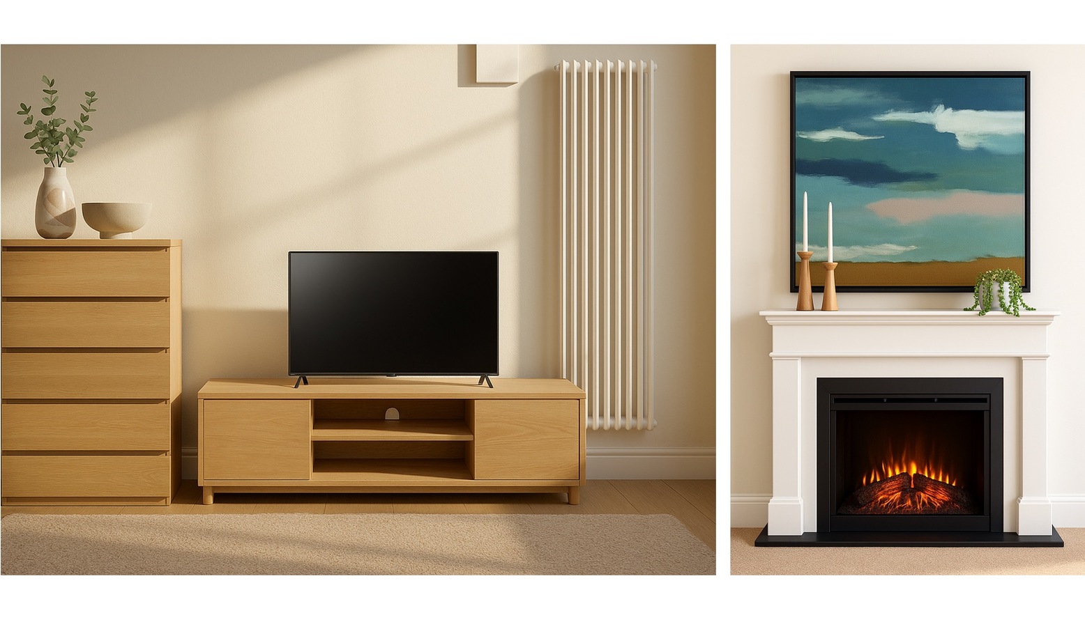 A stylish Abilen oak wood veneer TV stand, measuring 200 x 44 cm, serves as the focal point, complemented by two drawers for storage.