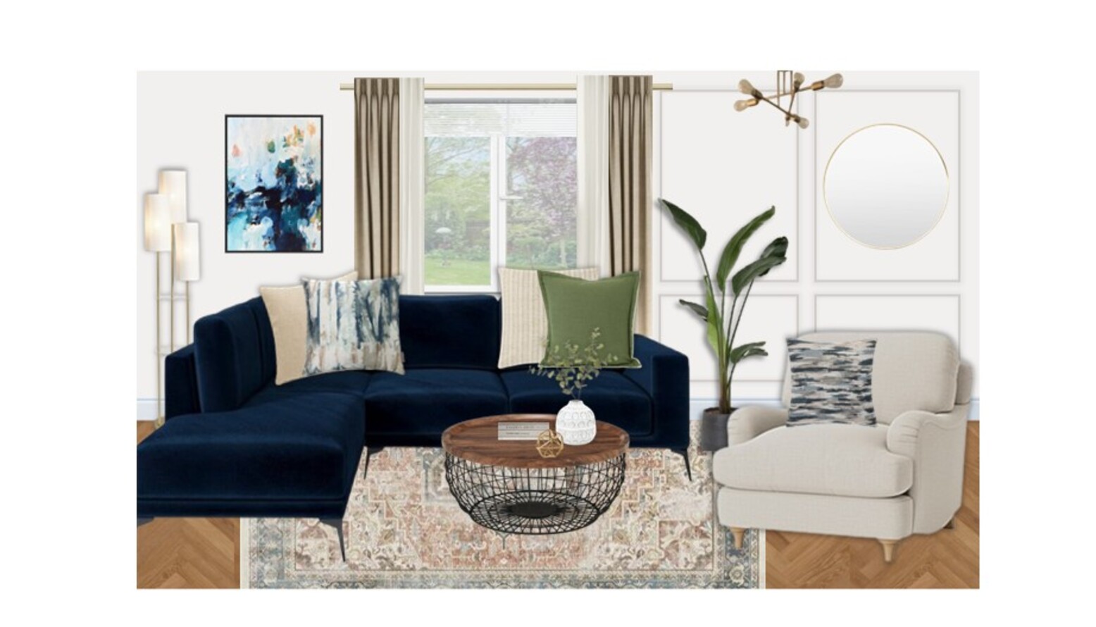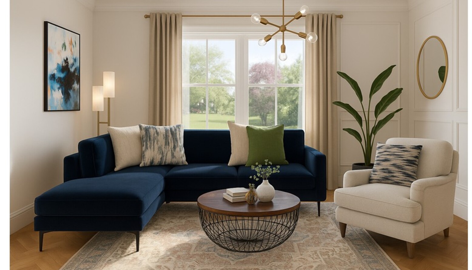 The room boasts a harmonious blend of elegance and comfort. A rich navy blue sectional sofa sits prominently, adorned with various cushions in soft greens and neutral tones that invite relaxation. A sleek and airy round coffee table, featuring a rustic wooden top and an intricate wire base, serves as the central focal point. Natural light pours through expansive windows, framed by delicate cream curtains that add warmth. In the background, a striking abstract artwork captures attention, infusing the space with artistic flair. A brass floor lamp stands tall beside the sofa, providing ample illumination and enhancing the modern vibe. A large round mirror hangs elegantly on the wall, reflecting light and creating a sense of openness. Completing the decor, a plush rug in muted tones underfoot ties the elements together, ensuring a cozy atmosphere. Tall indoor plants are strategically positioned, bringing a touch of nature indoors and enhancing the inviting ambiance. This room is a perfect balance of contemporary style and timeless charm.