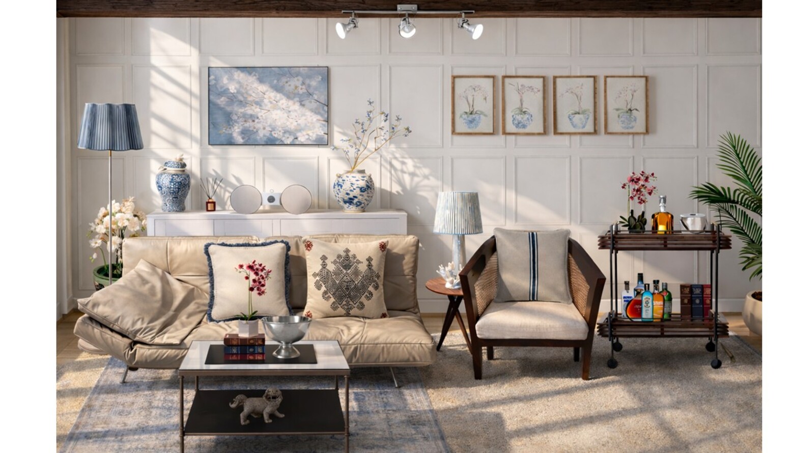 Artwork is prominently displayed on the wall, featuring floral prints that harmonize with the overall scheme. Above, the natural light casts playful shadows, enhancing the textures of the wood panelling and rugs.