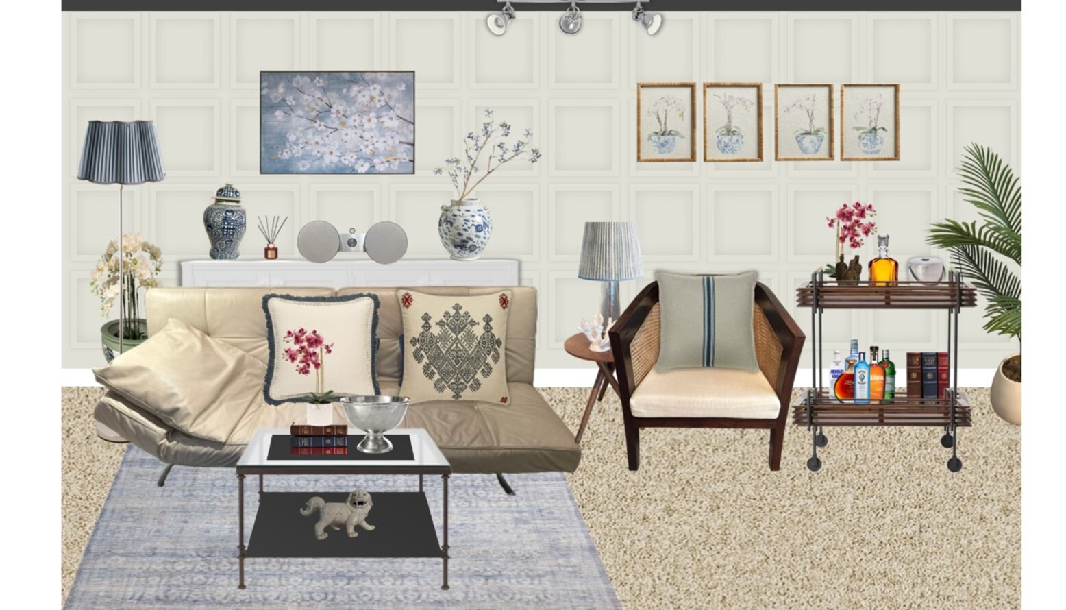 Accessorizing the space are decorative items including a blue glass candlestick holder, an ice bucket, and tasteful greenery from an artificial artichoke stem. The space is enriched with carefully chosen pieces that balance elegance and comfort, creating a cozy yet sophisticated atmosphere.