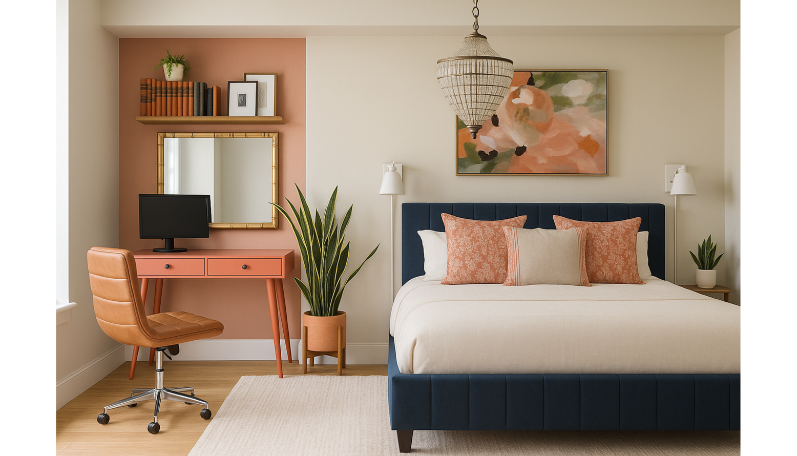 A stylish burnt orange spindle desk sits adjacent to the bed, paired with a chic tan office chair, creating a cozy workspace. Above the desk, a mirror in a bamboo frame reflects light, making the space feel brighter, while a shelf above it displays carefully arranged books and decorative items.