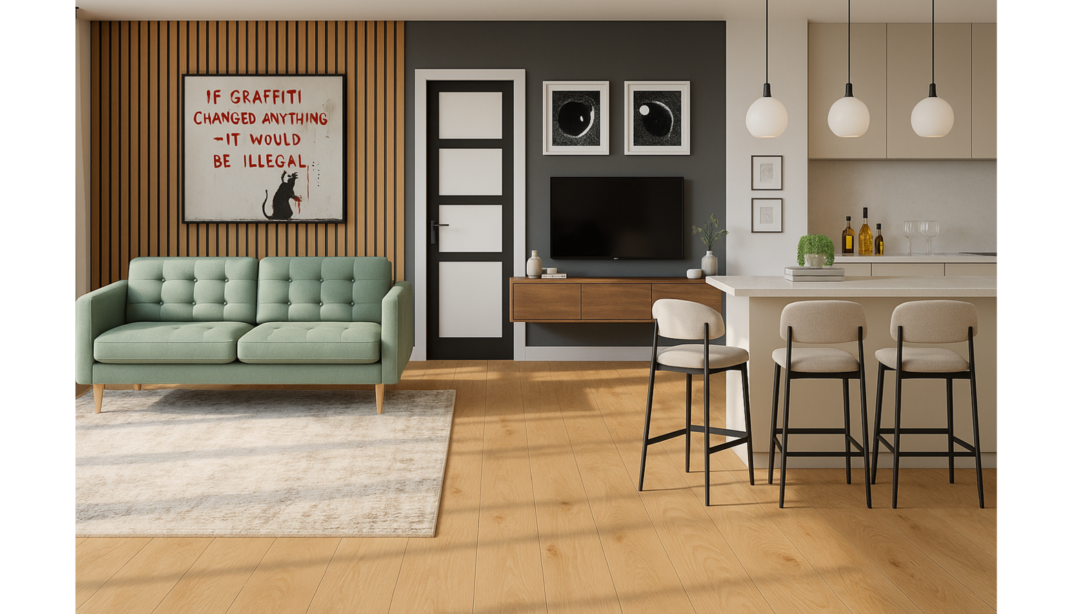 Art pieces that celebrate a musical theme are thoughtfully placed, bringing personality and cohesion to the design. The wall-mounted TV unit is practical yet stylish, ensuring the space remains organized and uncluttered. Recessed lighting enhances the ambiance, while the sleek Calex Vista Edge Tunable White LED Light Strip elegantly illuminates the bar area, emphasizing a contemporary vibe.