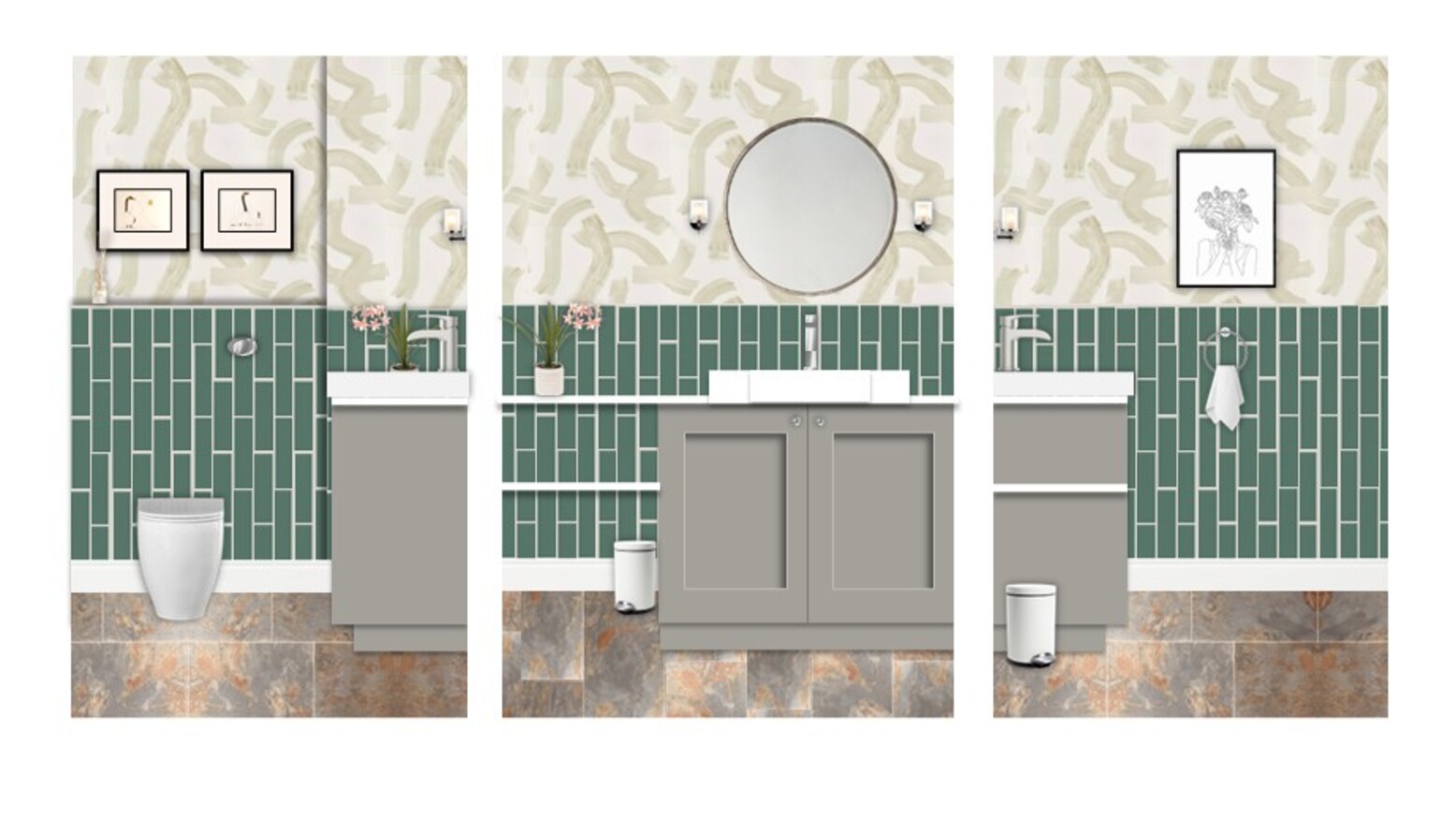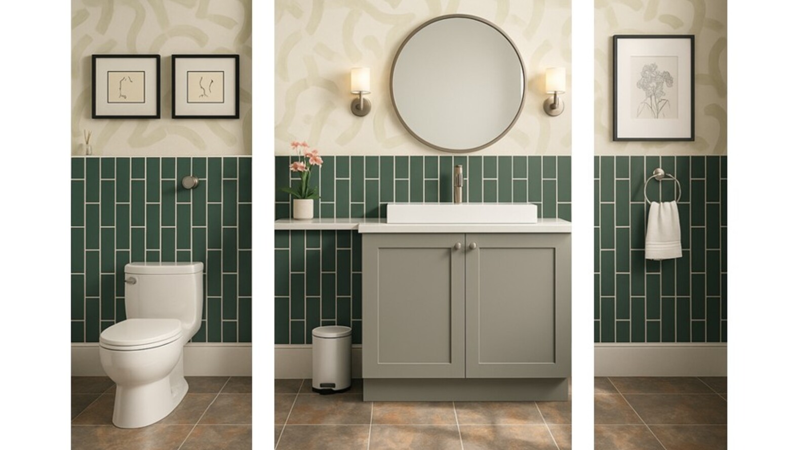 This bathroom design exudes a contemporary feel with its soothing blend of materials and colors. The walls are adorned with Clarke & Clarke Malevich Wallpaper, featuring an abstract pattern that adds visual interest. A vibrant, deep green tile adorns the lower half of the walls, harmonizing beautifully with the light, textured wallpaper above.