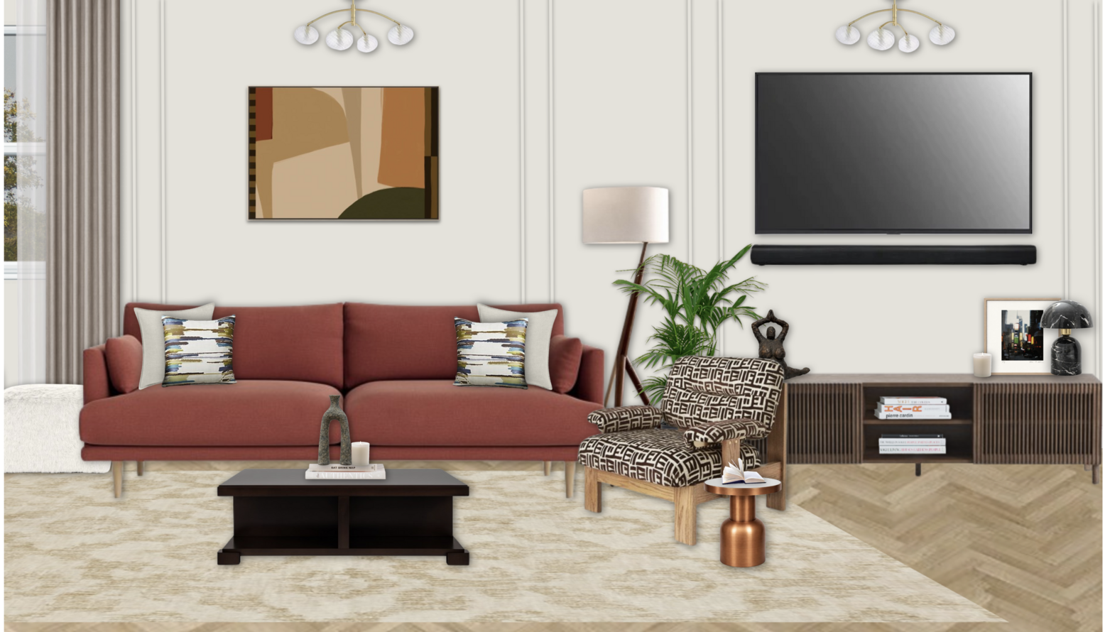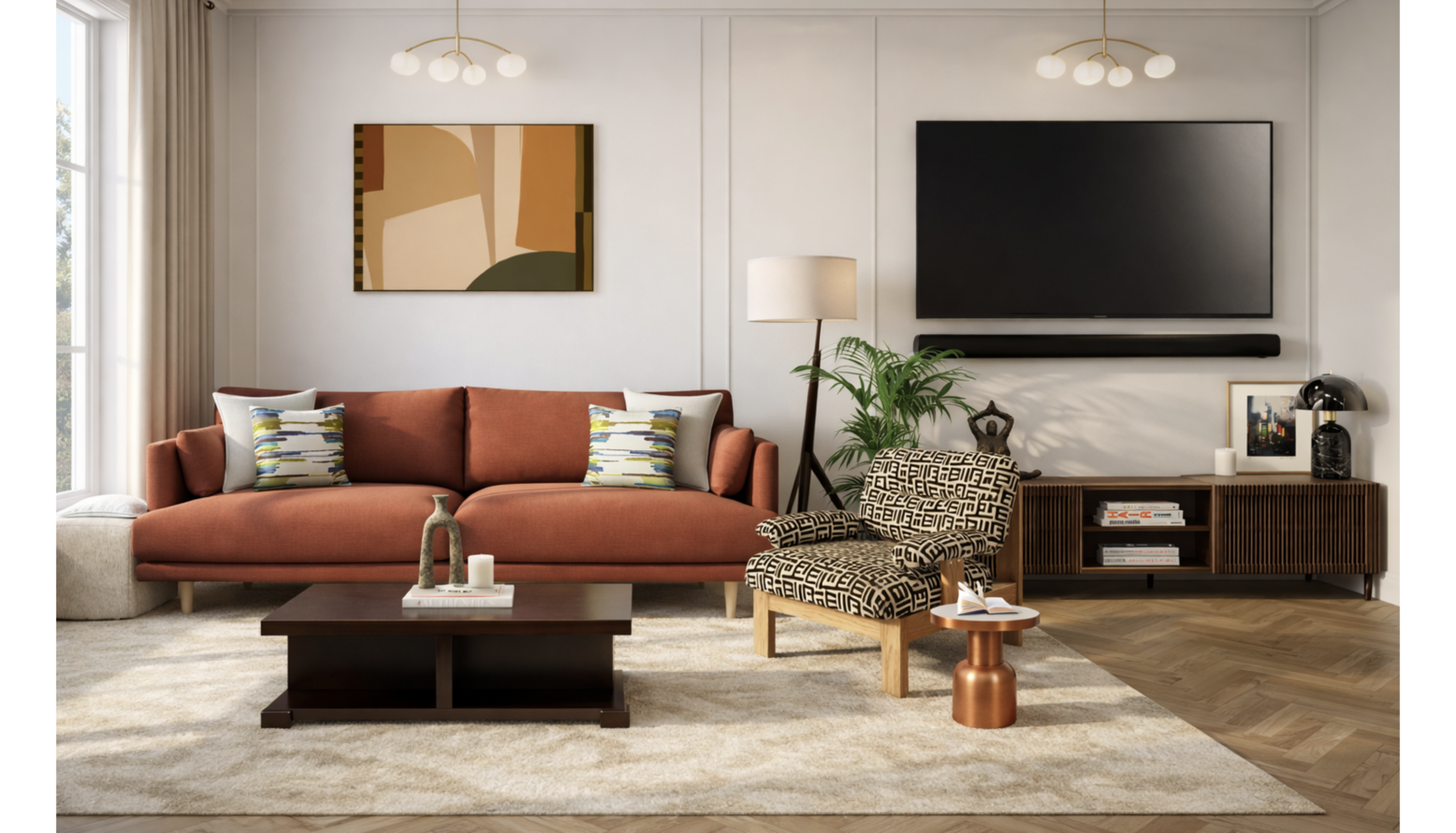 A rich, burnt-orange sofa anchors the space, providing a bold focal point. Positioned across from the sofa, a sleek TV stand in ash veneer and solid ash wood with a walnut-tone finish harmonizes with the soft tones of the room.