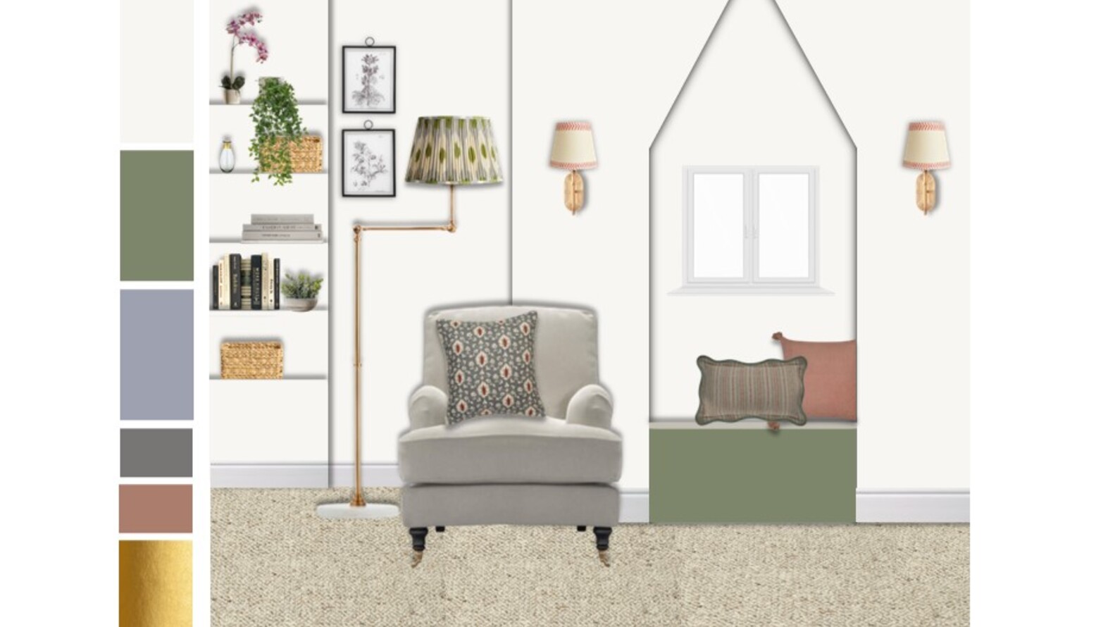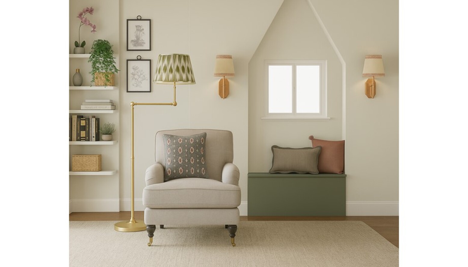 This landing space exudes a harmonious blend of comfort and style. At the center, a sophisticated armchair upholstered in a soft beige fabric invites relaxation, adorned with a decorative cushion featuring intricate patterns in muted earth tones. A stylish floor lamp stands beside it, with a striking grey-green empire shade that adds a modern twist to the classic design. On the adjacent wall, custom wall-mounted shelving holds an array of curated decor, including a large smoke glass vase and books, adding both function and flair. A verdant plant adds a touch of nature, enhancing the overall ambiance. Beneath a cozy window, a practical seating area is created with a lidded willow storage trunk, offering both style and usefulness, while additional cushions in coordinating tones provide extra comfort. This nurturing space, with its light and airy atmosphere, embodies warmth and character.