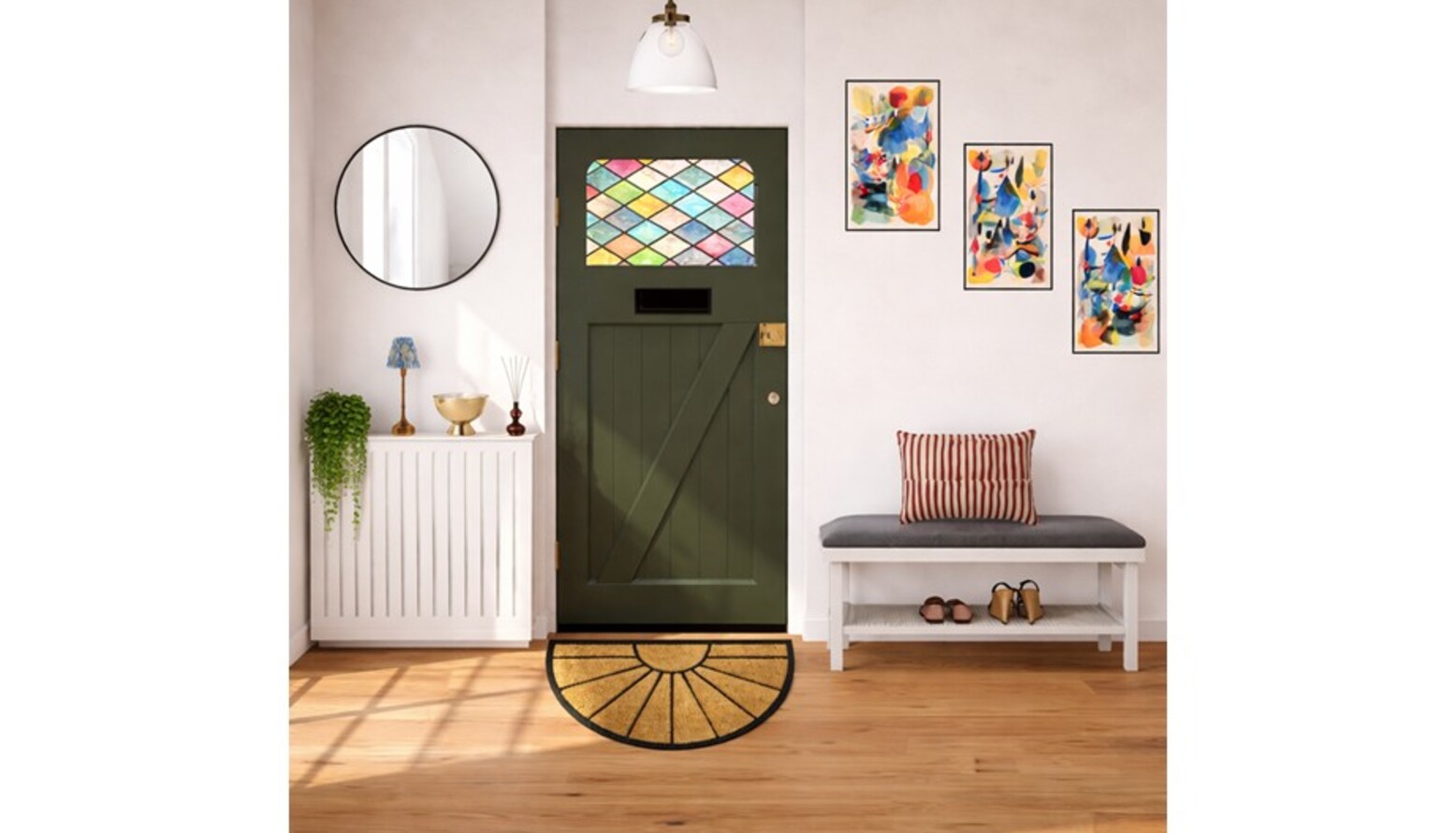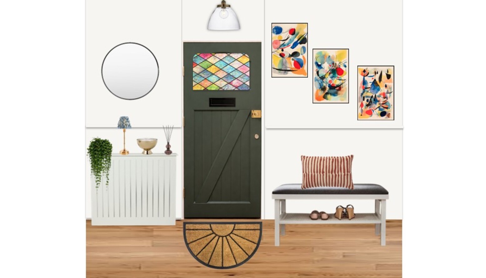 The room showcases a blend of contemporary design elements with an inviting atmosphere. A striking green door with a colorful stained glass panel serves as a focal point, creating a vibrant entryway. To the left, a sleek white radiator is partly obscured by a lush green plant that adds freshness to the space. On the opposite wall, a stylish gray bench is complemented by a striped cushion, offering a comfortable spot for seating. Beneath the bench, practical storage is visible, ideal for shoes and other essentials. Above the bench, a series of colorful artworks creates a playful gallery wall, enhancing the room’s artistic vibe. An elegant round mirror hangs nearby, reflecting light and adding depth to the entryway. The flooring features warm wood tones, grounding the space and enhancing its cozy feel. To illuminate the area, a modern pendant light hangs above, combining functionality with style.