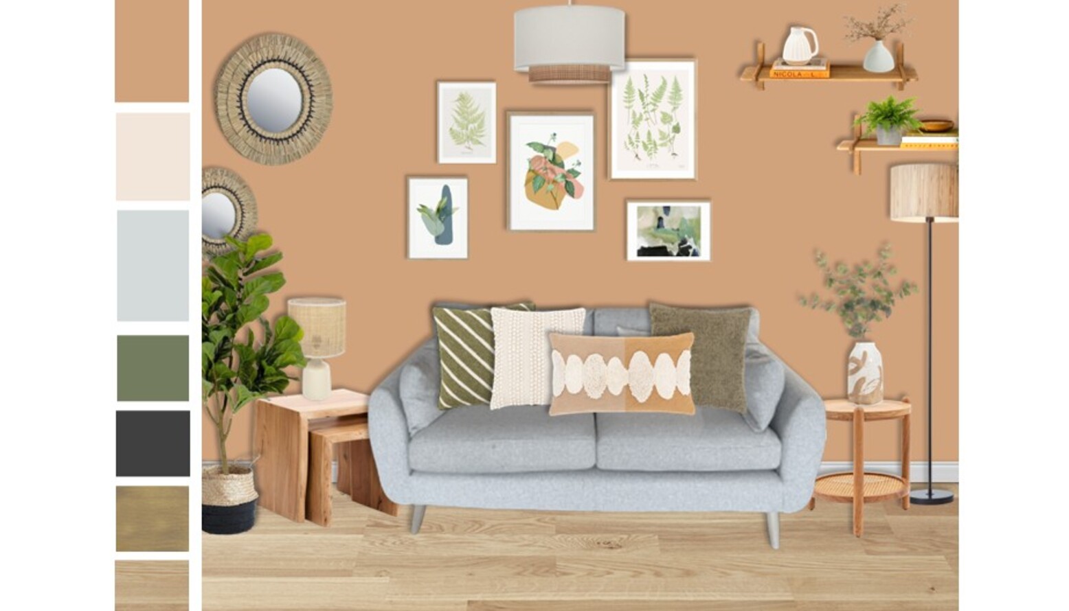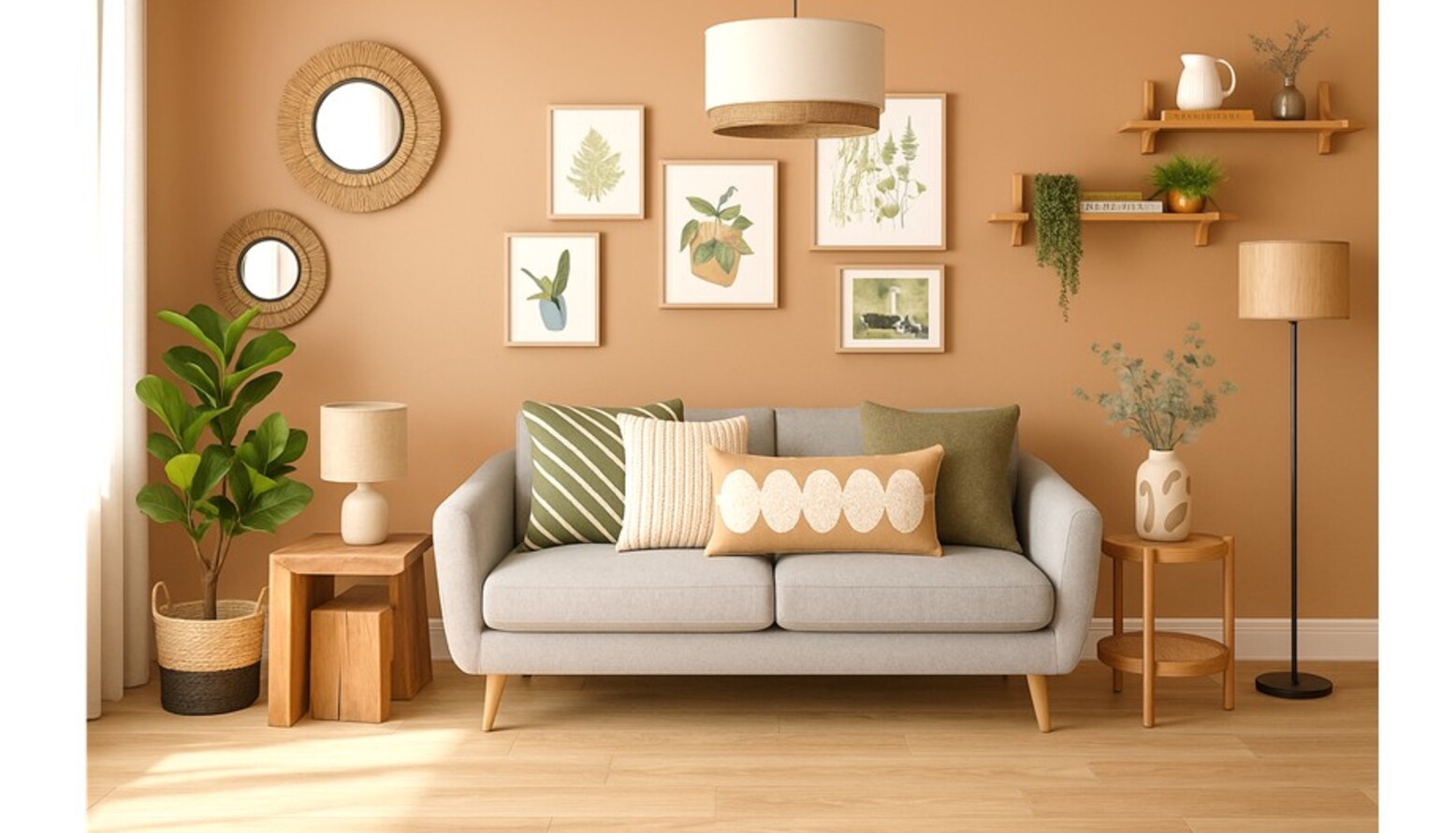 This room exudes a warm and inviting atmosphere with its earthy tones and natural elements.