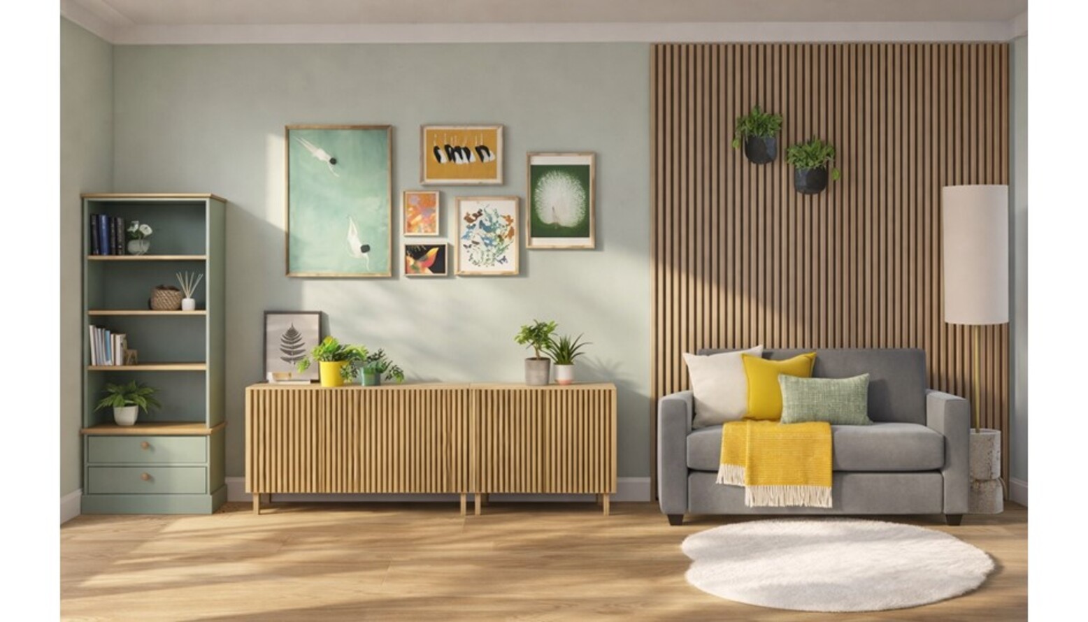 A sleek, fluted sideboard made of light wood runs along one wall, providing both storage and a stylish surface for plants and decorative items. Above it, a curated gallery wall showcases an array of vibrant artwork, adding character and personal charm.