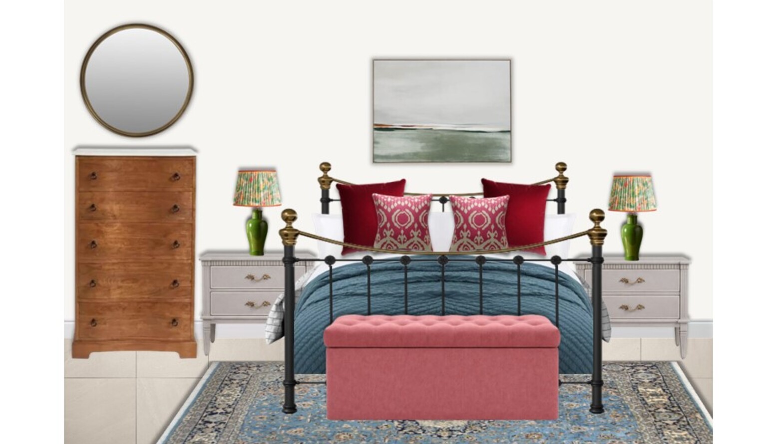 The room exudes a warm and inviting atmosphere through its thoughtful design elements. The centerpiece is a black iron bed frame adorned with luxury bedding in blue and white hues, complemented by a mix of decorative pillows featuring varied patterns in rich reds and pinks. Flanking the bed are two stylish nightstands, each with crisp white finishes and subtle drawer details. Above the bed, a large abstract artwork in soft greens and muted tones creates a stunning focal point. A pink tufted blanket box at the foot of the bed adds both beauty and functionality, while a richly patterned area rug in blue anchors the space with a sense of coziness. To the left, a tall wooden chest in a honey finish stands majestically, offering storage and a touch of classic charm. Beside it, a vibrant green lamp with a decorative shade injects a playful pop of color, mirroring the bright tones of the scatter cushions on the bed. Natural light filters in through the room, accentuating the textures and colors of the carefully curated decor, making the space feel open and airy. Overall, this room combines elegance with comfort, creating a truly personalized retreat.