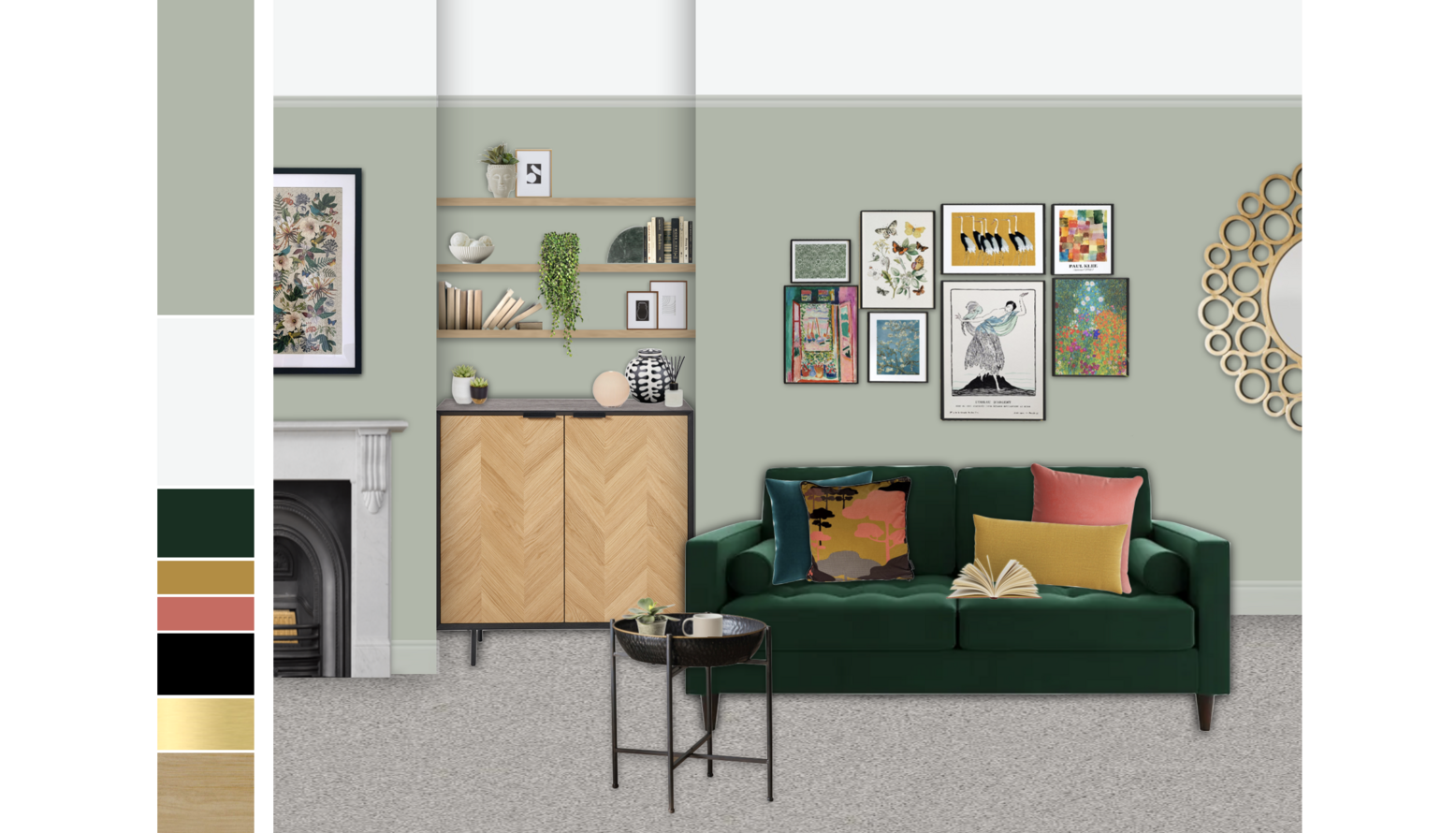 This home office features a calming color palette, with gentle green walls that create a serene working environment. A stylish dark green sofa, adorned with vibrant cushions in dusty rose and mustard, invites relaxation and inspiration. Adjacent to the sofa, a modern black and natural chevron bar cabinet serves both aesthetic and functional purposes, complemented by a sleek black side table that adds elegance without overwhelming the space. Above, art pieces are carefully arranged on the walls, showcasing a mix of framed prints in various sizes, adding character and visual interest to the room. The room's layout is finished with a light carpet that softens the overall feel and a subtly placed fireplace that adds a touch of coziness. Floating shelves display curated books and decorative elements, while a round mirror provides a stylish focal point, reflecting light and enhancing the sense of space.