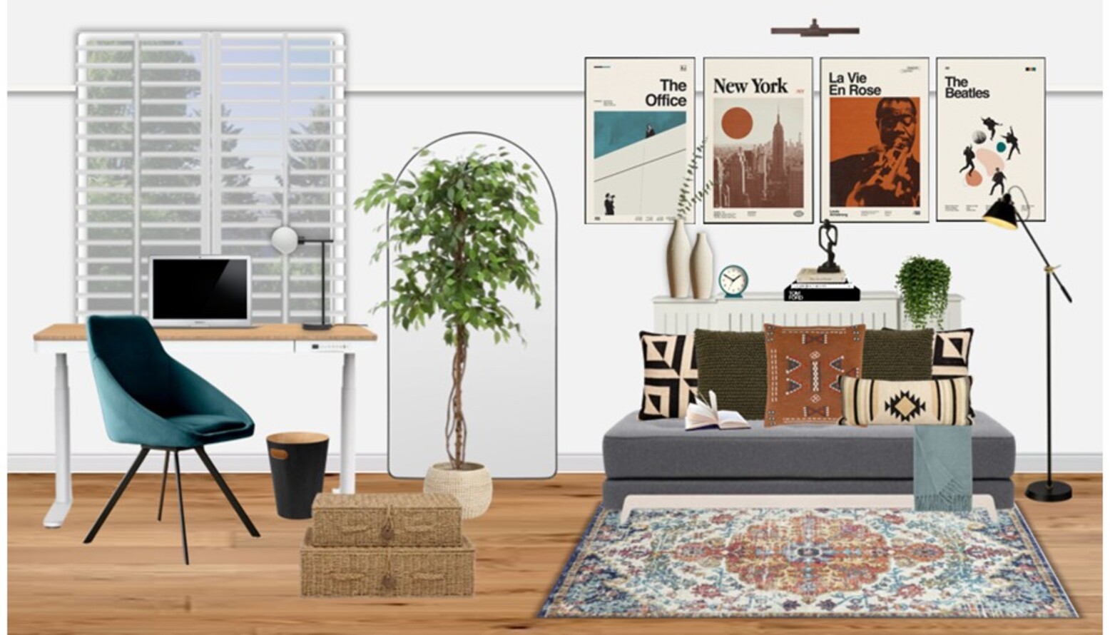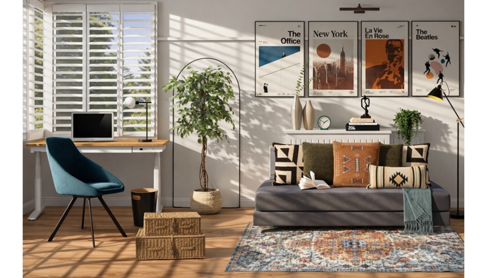 Near the window, a streamlined desk space integrates functionality, featuring a minimalist design with a computer setup and a stylish lamp.