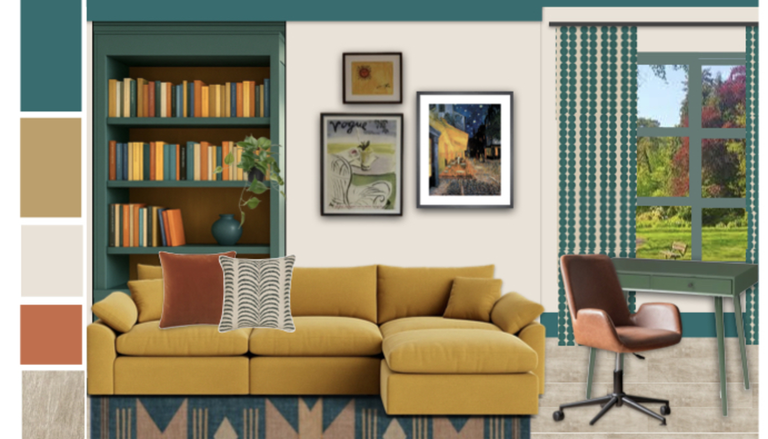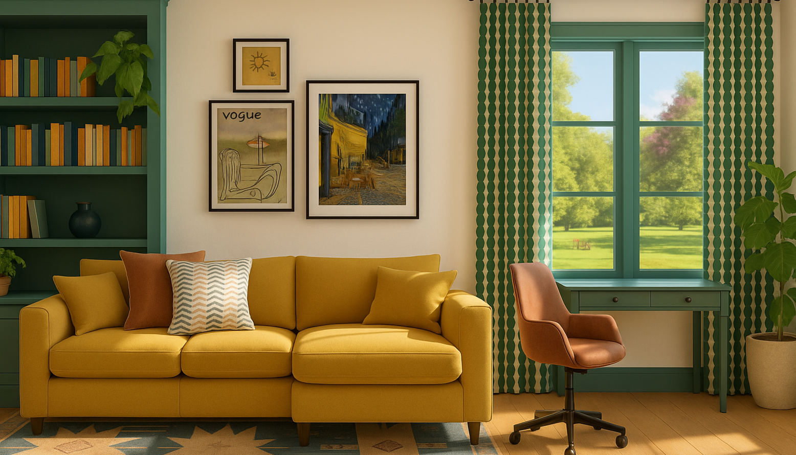 Natural light pours in through large windows, framed in the same deep green as the bookcase, which harmonizes with the leafy view outside. The window is dressed with patterned curtains that playfully echo the green tones, further enhancing the room's character. A stylish brown swivel chair at a matching desk offers a functional workspace without compromising on aesthetics.