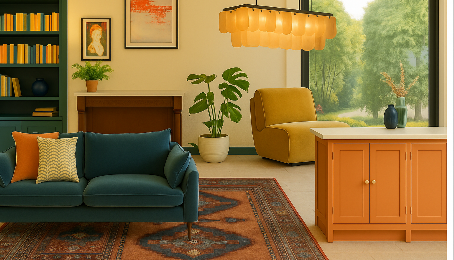 A sleek sideboard in a warm orange tone complements the space, serving both functional and aesthetic purposes. Above, a Danetti Estelle white glass adjustable pendant light illuminates the room with a soft, warm glow, enhancing the inviting ambiance.