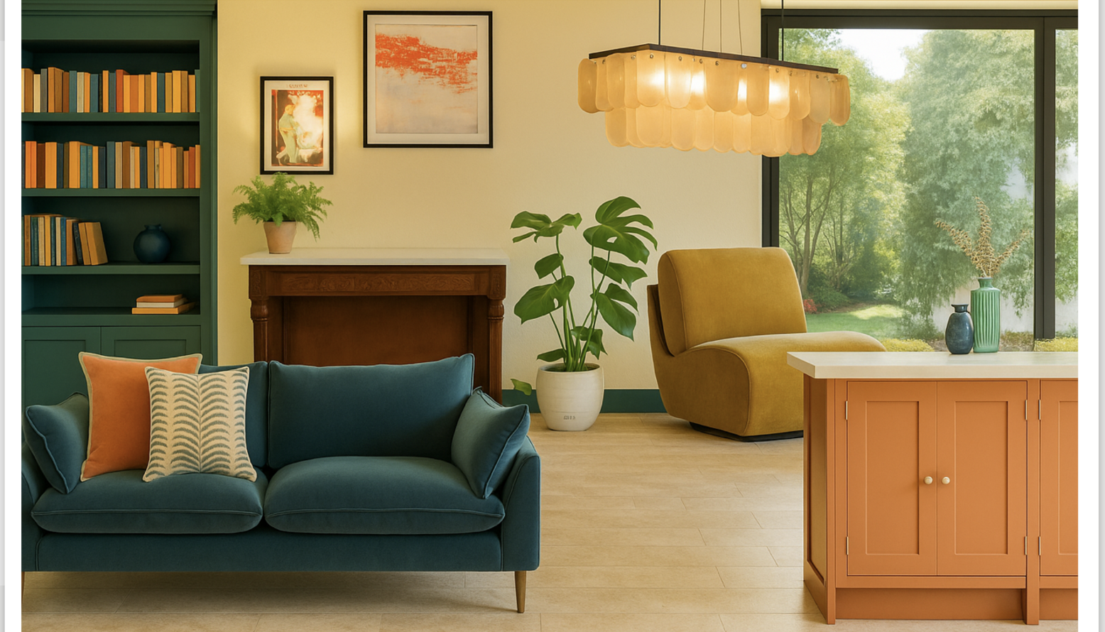 A tall, vibrant green plant flourishes beside the windows, adding a natural element and enhancing the freshness of the design. The bookcase, finished in a deep green, highlights an array of books with charming spines in orange and blue, adding personality to the decor.
