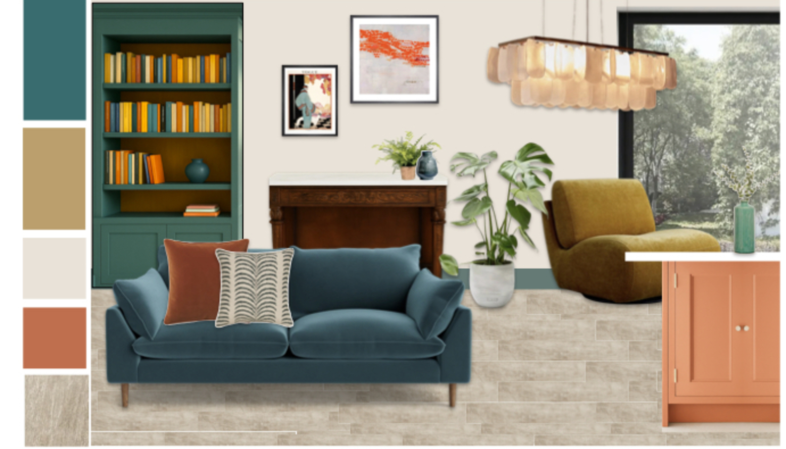 Art pieces are strategically placed, including a colorful abstract painting and a portrait, adding depth and sophistication to the room’s vibe. The walls are embraced with a soothing slaked lime paint, while the woodwork and bookcase are elegantly finished in the Canton color, tying the elements together beautifully.