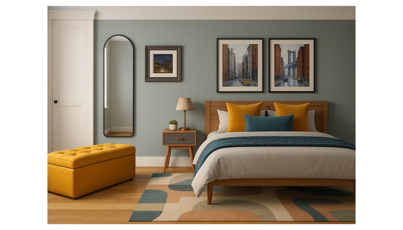 At the center, a wooden bed with a clean design features a soft grey duvet layered with an array of vibrant throw pillows in shades of mustard yellow and deep teal.