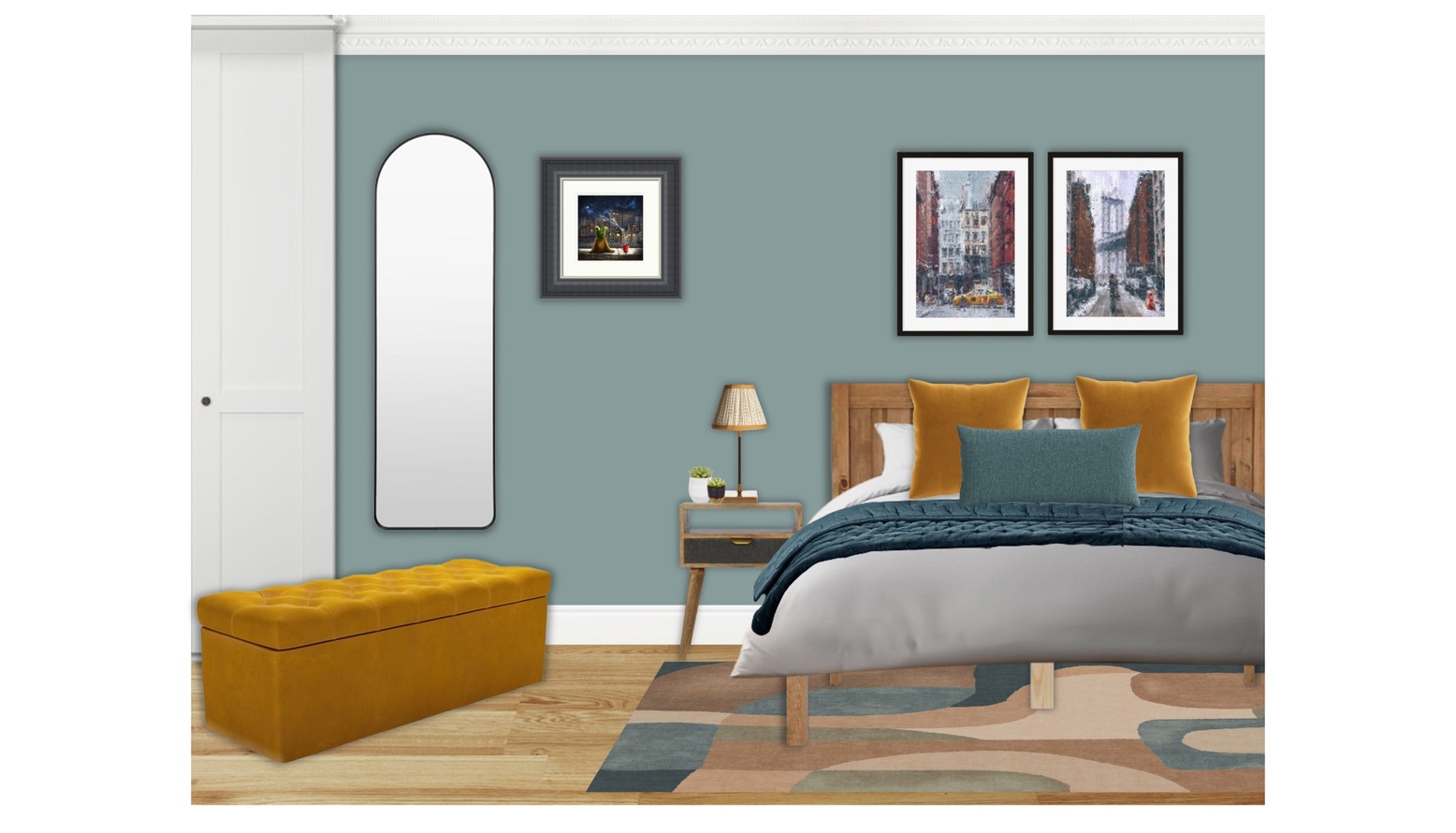 Complementing the design is a Sonia Sand & Ocean Flatwoven Rug, whose organic shapes and neutral palette anchor the room's color scheme. A luxurious Valentin Blanket Box in amber smart velvet not only serves as stylish storage but also introduces a pop of color, echoing the mustard tones in the cushions.