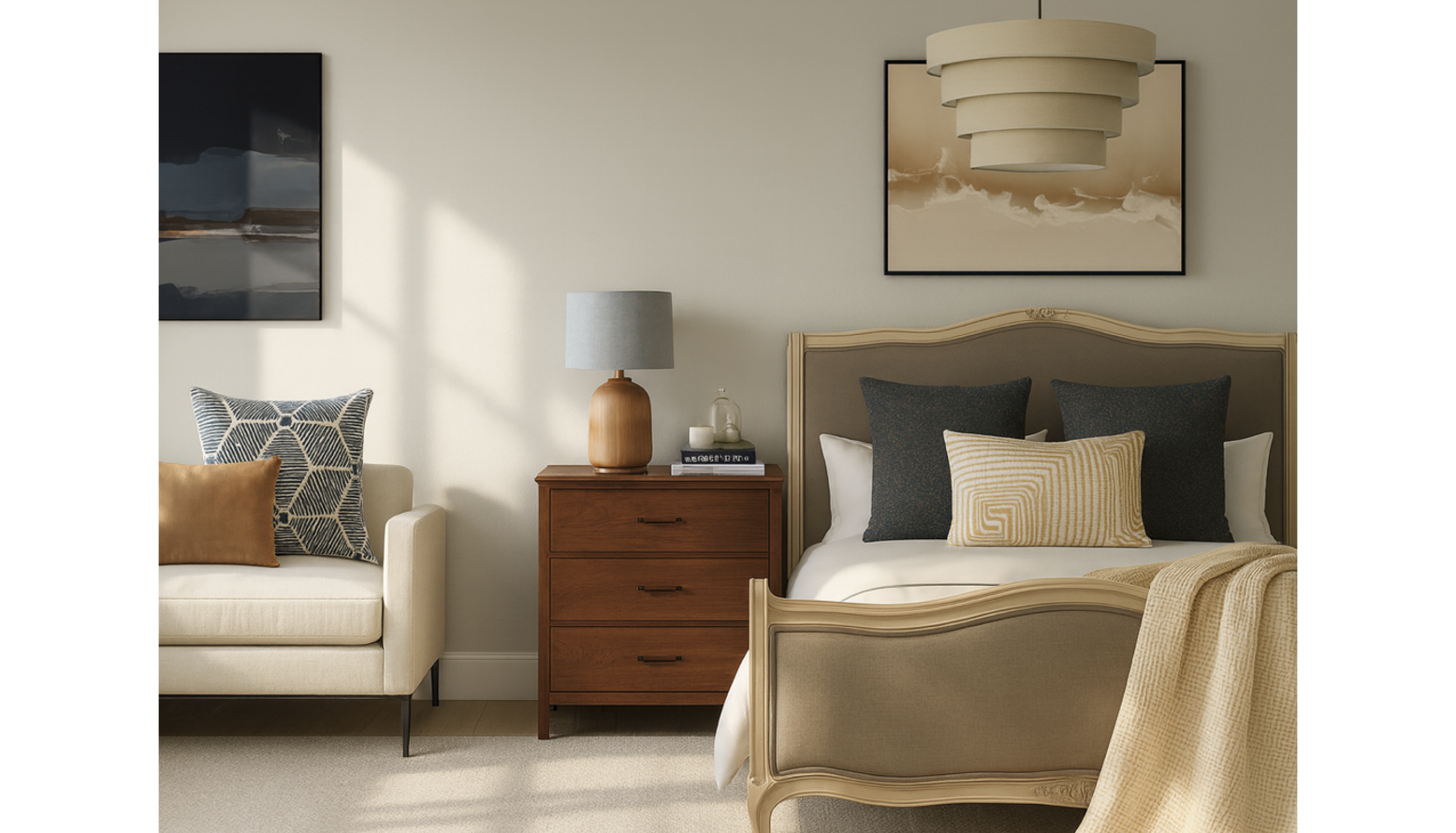 Above the bed, an abstract artwork in soft earth tones adds depth to the room, echoing the natural ambiance created by the choice of colors.