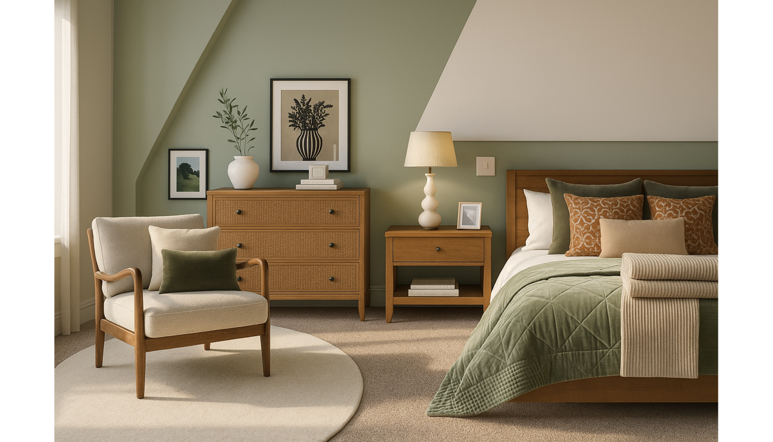 This stylish bedroom design features a calming palette with a soft green accent wall that provides a serene backdrop. The focal point is the elegantly framed bed dressed in soothing tones, including a textured quilt and a variety of cushions in warm earth shades, adding depth and comfort. To the side, a mid-century inspired Witley Chest of Drawers complements the overall aesthetic with its natural wood finish and simple lines. This is paired with a classic accent chair in neutral boucle fabric, providing a cozy nook for reading or relaxation. A stunning round rug anchors the space, harmonizing beautifully with the furniture while adding a touch of softness underfoot. Artwork adorning the walls, including a striking framed print and a chic vase with foliage, creates visual interest and personalizes the room. Lighting is thoughtfully placed with a stylish table lamp, illuminating the bedside area while enhancing the room’s overall ambiance. The entire space exudes a sense of tranquility, making it the perfect retreat for relaxation and rejuvenation.