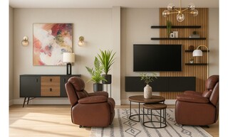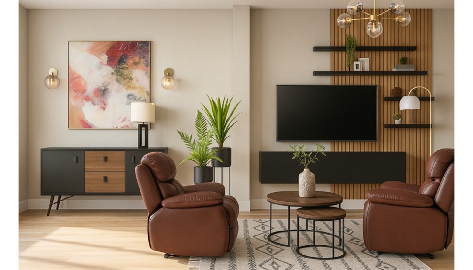 The seating area is adorned with rich brown leather recliners that invite relaxation, complemented by a round nesting coffee table in a warm walnut finish. The table adds functionality without compromising on aesthetic appeal. An elegant floor lamp with a grey shade stands nearby, illuminating the area with soft light.